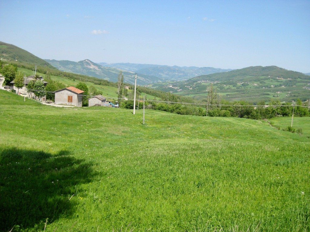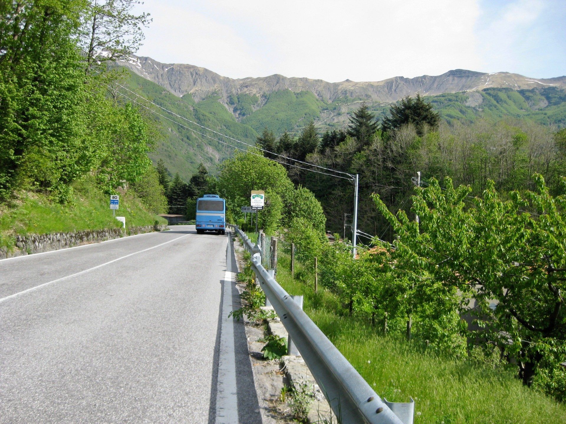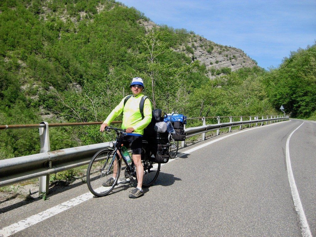 Um 5.56 Uhr werde ich wach. Es ist richtig schönes Wetter, heute könnte es heiß werden. Sachen zusammen packen und erst einmal gut Frühstücken. Beim Beladen der Räder stellen wir fest, dass wir das Gepäck gewichtsmäßig nicht richtig verteilen können. Wir haben ein Zelt sowie Isomatte und Schlafsack gegenüber den anderen Touren mit. Wir haben keine Vorderradtaschen, also muss alles hinten auf das Rad. Wir bauen ganz schön hoch. Nach anfänglichen Schwierigkeiten gewöhnen wir uns dann aber an das Fahren. Geht ja auch nicht anders. Anfängerfehler mit dem ganzen Gepäck ! Hinter Maranello geht es gleich steil in die Berge. Wir quälen uns bei blauem Himmel und 30 Grad die Berge hoch. Unterwegs bekommt Dieter erst einmal ein Hütchen und das auch noch geschenkt. Er stellt fest, das er viel zu viel eingepackt hat, jetzt ist die Erkenntnis zu spät. In Pavullo nel Frignano müssen wir zum ersten Mal die Wasservorräte auffüllen. Danach geht es die Serpentinen runter. Was für eine Abfahrt, aber wir Wissen, auf der anderen Seite geht es wieder hoch. Es geht Richtung Vesale, es folgen lange und steile Anstiege. Unterwegs werden wir aber immer wieder mit traumhaften Aussichten entschädigt.