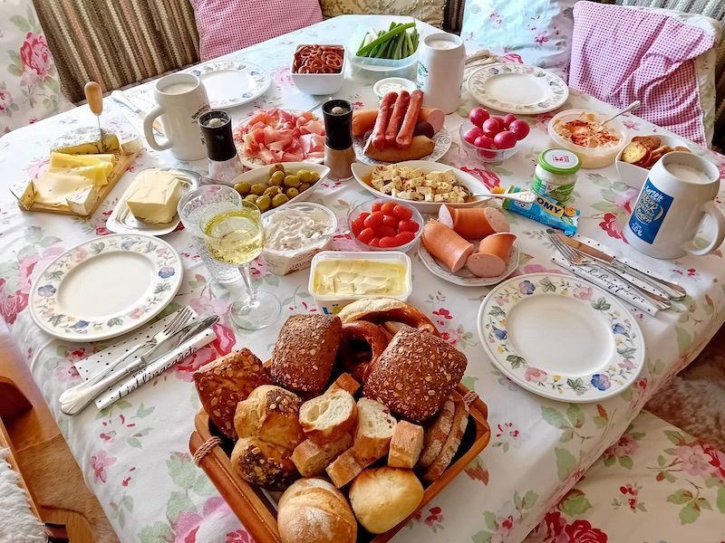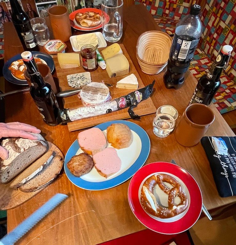 Zuhause schätzen wir unser Frühstück: die Brötchen vom Bäcker unseres Vertrauens / alles im Kühlschrank, was wir mögen.