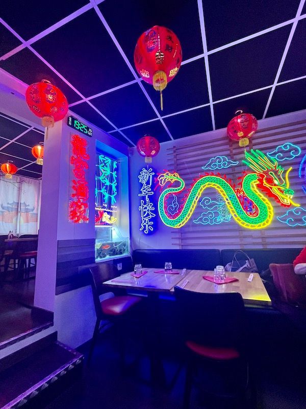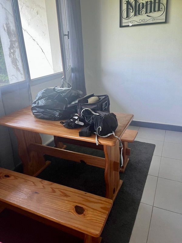 Bescheiden platzieren wir uns an eine Holztischgarnitur.