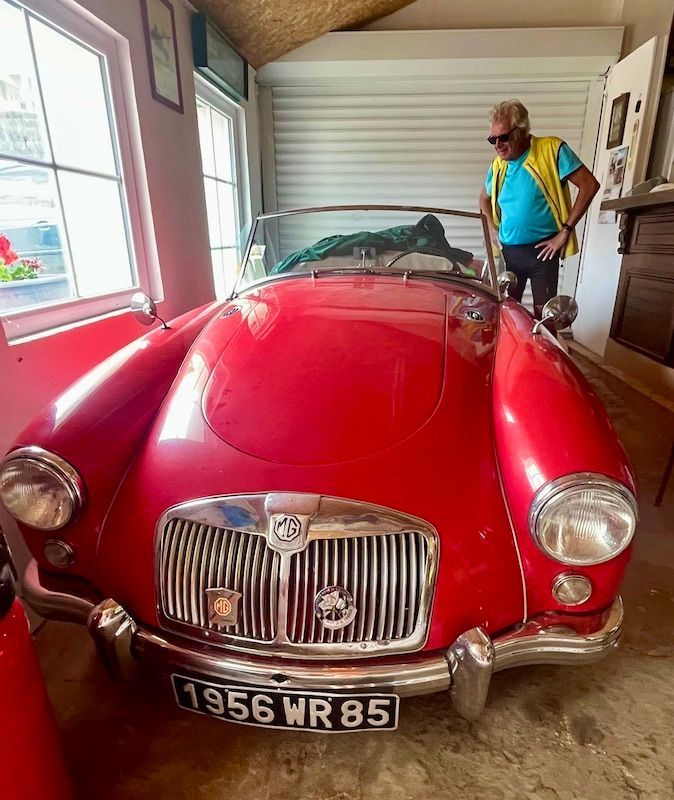 Stolz enthüllt er / zum Vorschein kommt ein roter MG Cabrio - Originalausstattung aus dem Jahr 1956 - erstzugelassen in Kalifornien,