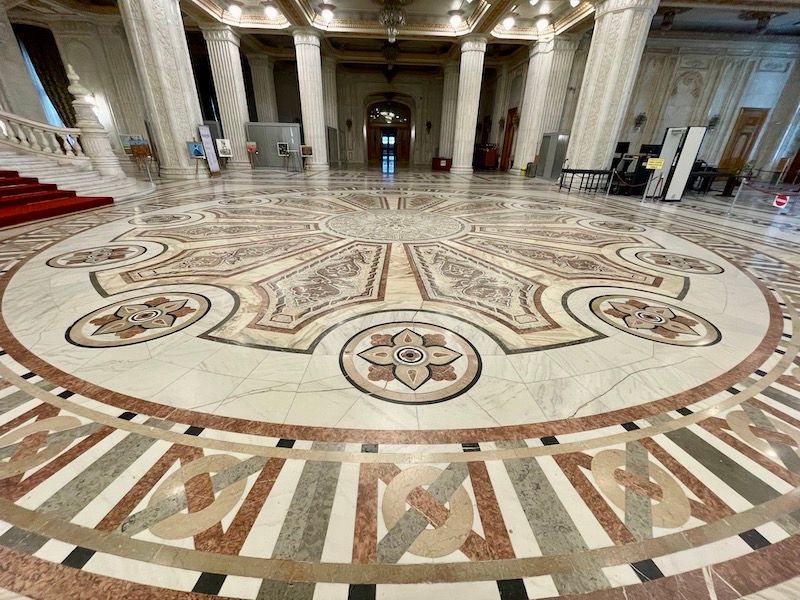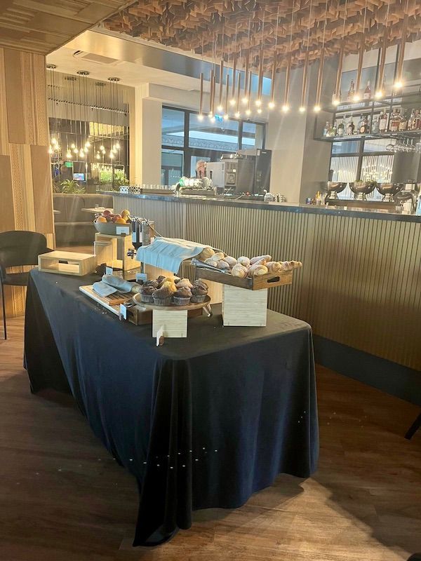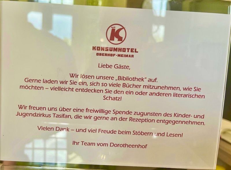 An der Rezeption wird auf die Schließung der hoteleigenen Bibliothek hingewiesen.