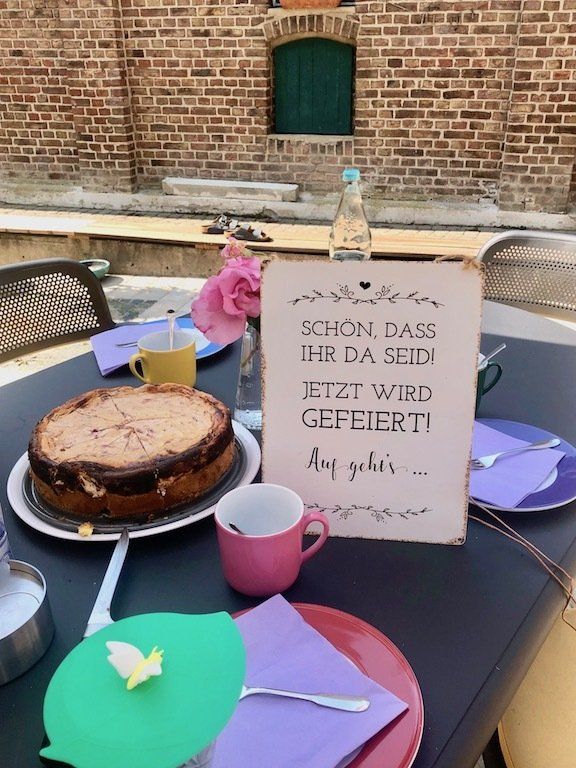 "Schön, dass Ihr da seit! Jetzt wird gefeiert," steht auf dem Schild, welches die Kaffeetafel bei Jutta und Michael (Freunde und unsere heutigen Gastgeber) zierte.