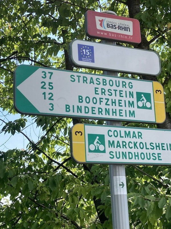 Auf einem Schild lesen wir: „Sie haben die letztmalige Gelegenheit die Seite zu wechseln, wenn sie nach Mainz mit dem Rad wollen.“
