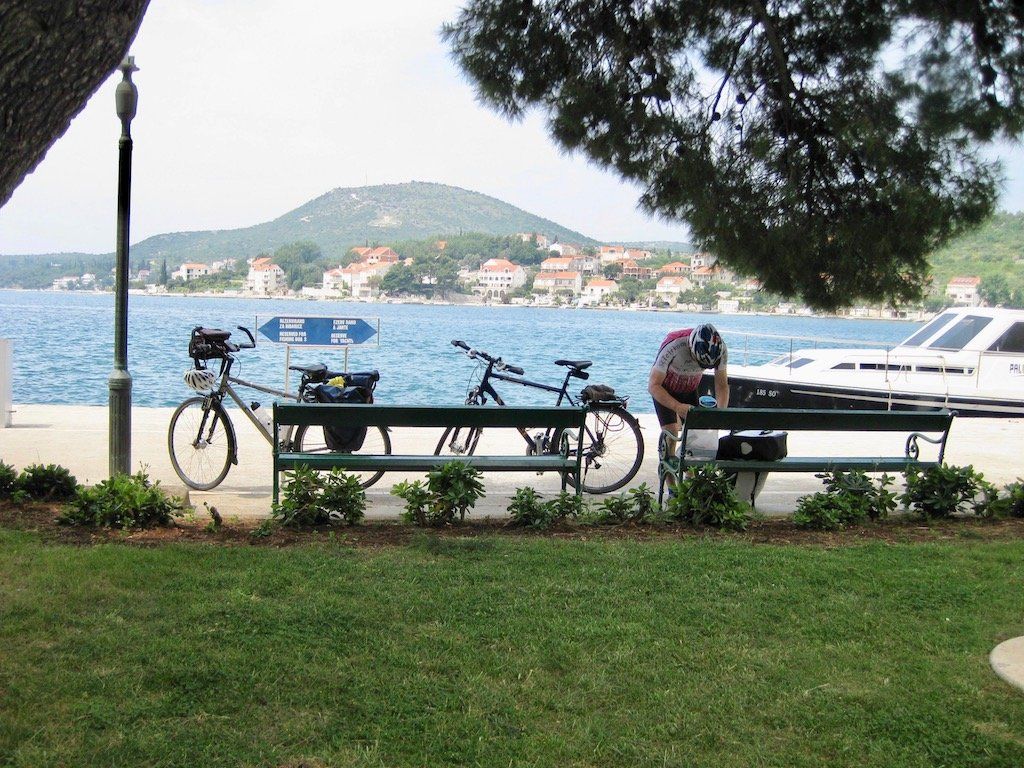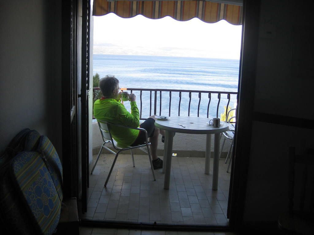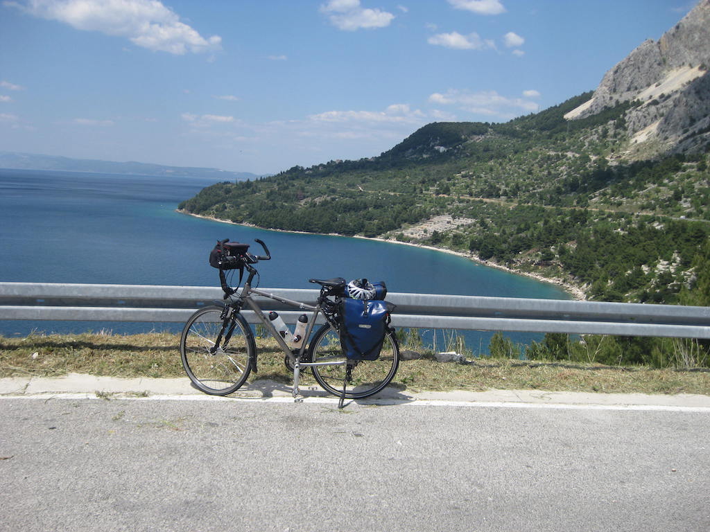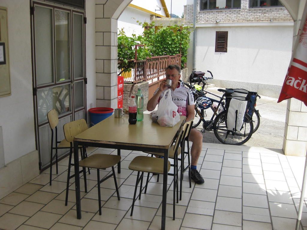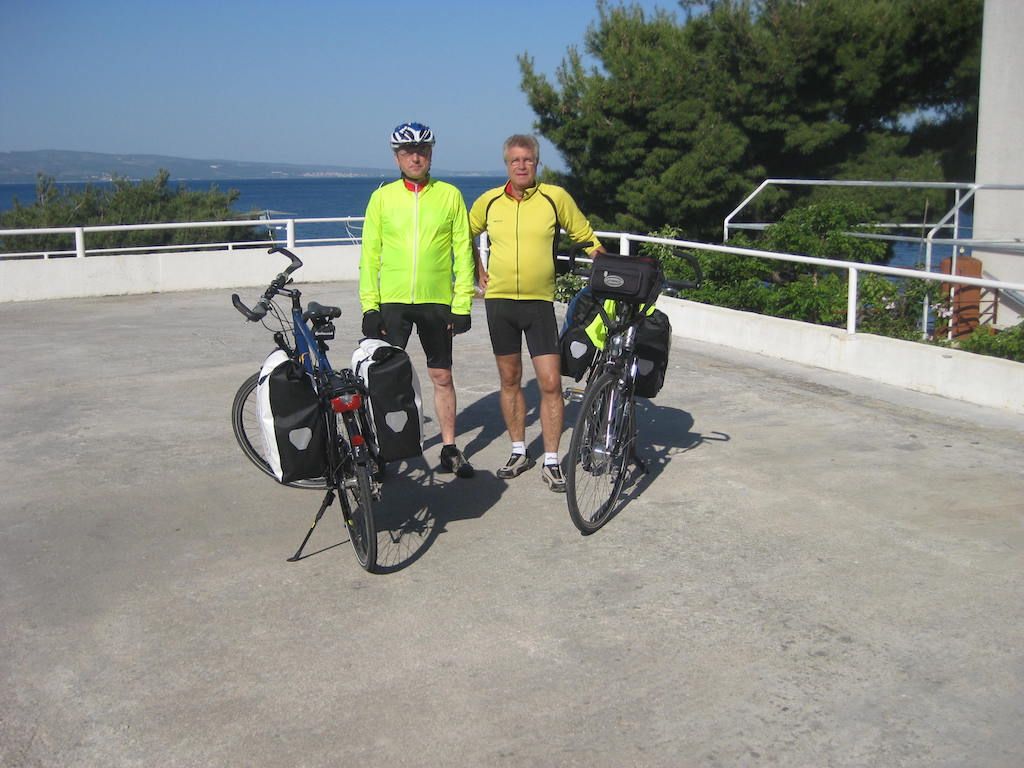 Montagmorgen, wir haben keine Kuna mehr, also gibt es auch kein Frühstück. So früh hat noch nichts auf, wo wir Geld tauschen können. Die letzten Müsliriegel müssen herhalten, Cappuccino gibt es auch dazu. Auf dem Weg nach Makarska knacken wir die 1000 Kilometermarke. In Makarska tauschen wir erst einmal Geld. Dann geht es in den Supermarkt, das Geld wird gleich wieder umsetzt. Wir sind hungrig. Frühstück gibt es dann auf einer Bank an der Promenade im Hafen. Gestärkt nehmen wir die letzten Kilometer nach Omis / Nemira in Angriff. Beim Anstieg zur großen Bucht von U. Vrulja merke ich wieder, wie das Vorderrad unregelmäßig läuft. Hoffentlich nicht so kurz vor dem Ziel noch ein Plattfuß. Ich pumpe kräftig auf und meine, dass es falscher Alarm war. Wir kommen dann doch bis Nemira ohne Probleme durch. Unserer Vermieter Ivo empfängt uns und macht ein Ankunftsfoto. Bis hier sind wir jetzt 1.056 Kilometer geradelt. Es kommt uns gar nicht so viel vor, wenn man sich dann aber diese Strecke verinnerlicht, war es eine ganz schön weite Reise.
