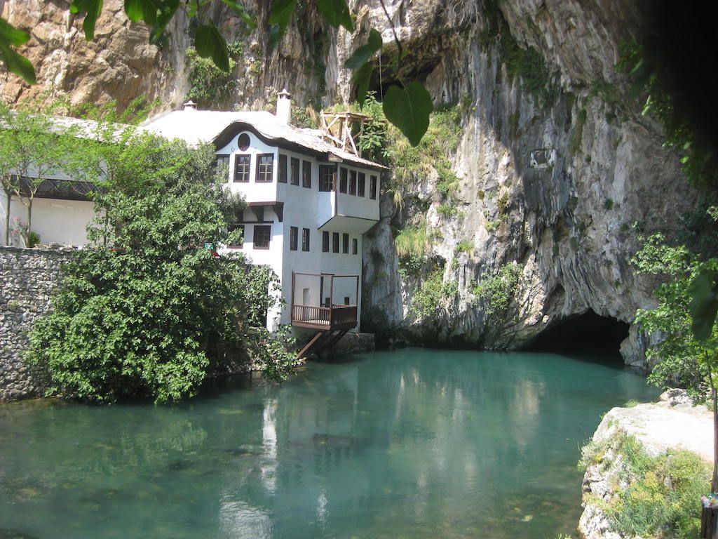 Der Wind ist auf einmal wieder da und bläst uns ganz schön entgegen. Das Fahren wird anstrengender. Eine kurze Mittagspause legen vor der Abzweigung nach Blagaj ein. Dann schlagen wir den Weg nach Blagaj zum Kloster ein - finden aber zunächst das Kloster nicht. Es liegt ganz schön versteckt. Erst auf Nachfragen sehen wir es. Da wir heute nach der Flachetappe mit etwas Wind genügend Zeit haben, beschließen wir, hier etwas zu Essen. Während des Essens fallen ein paar Regentropfen. Wir müssen uns mit dem Essen unter das Vordach setzen. Kaum sitzen wir, kommt aber schon wieder zu Sonne zum Vorschein.
