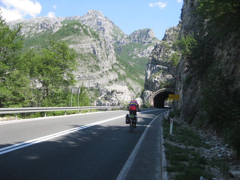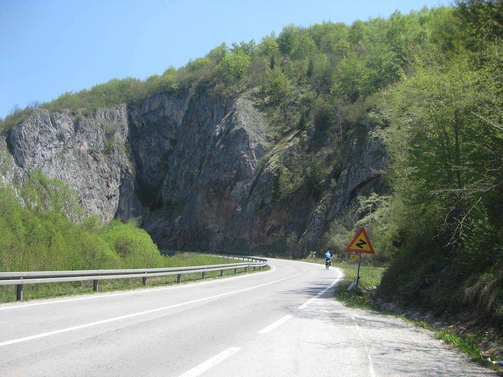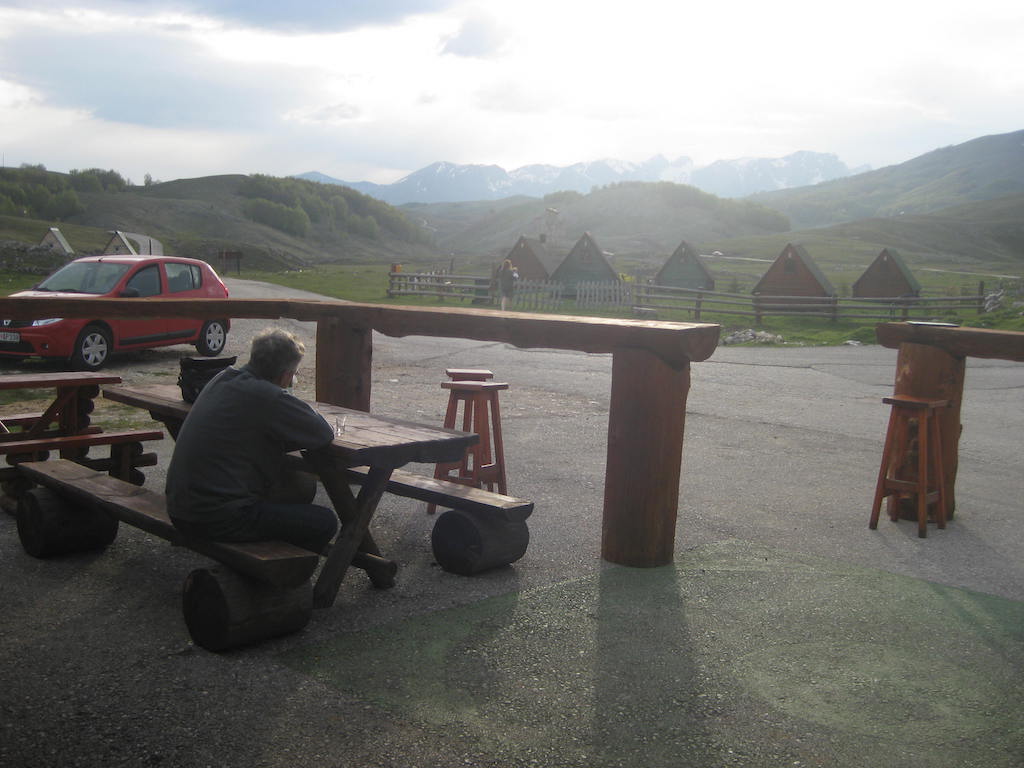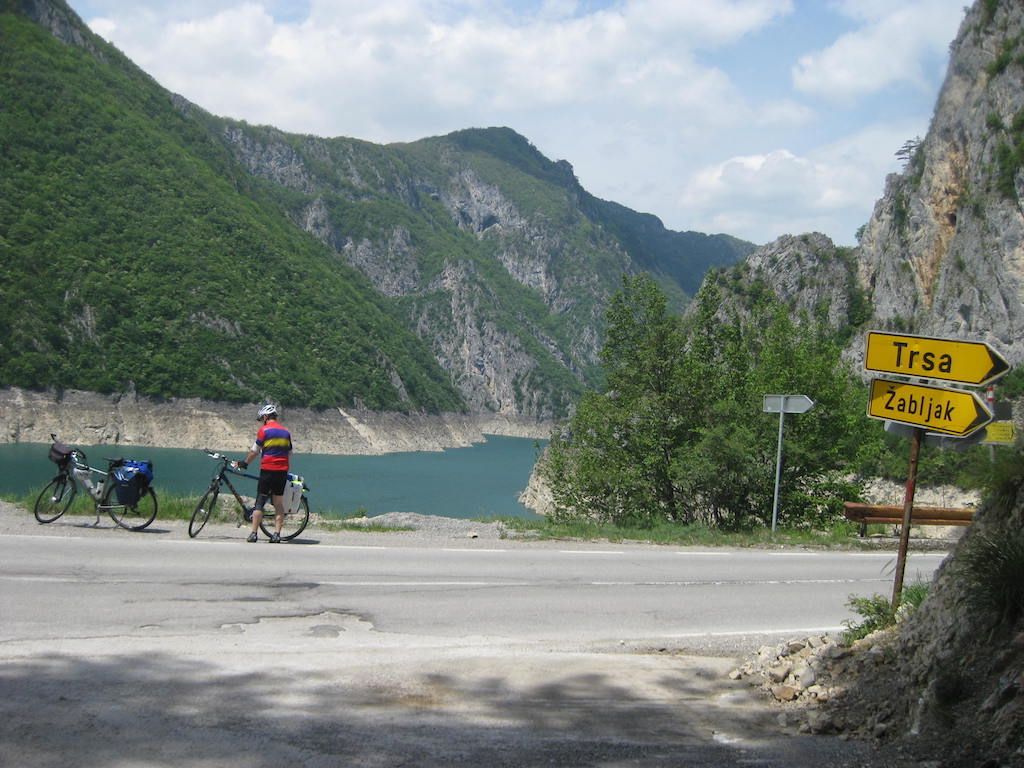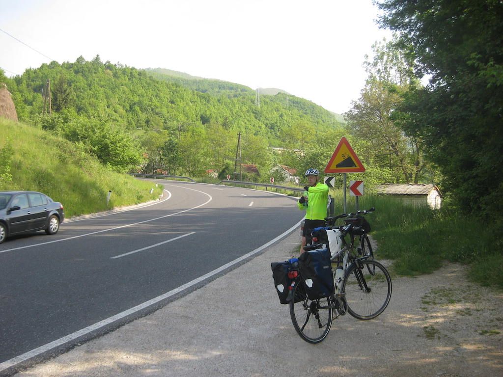 Nach 40 Kilometern hatten wir schon 800 Höhenmeter auf dem GPS. Das Wetter besserte sich zusehends. Unterwegs noch mal eine Pause. Hier stellte Dieter fest, dass seine Cappuccinodose umgekippt war und das Pulver sich in der ganzen Packtasche verbreitet hatte. Zum Glück war die Tasche dicht, sonst hätten wir nach dem ganzen Regen den Cappuccino aus der Tasche schlürfen können. Die Fahrt nach Niksic zog sich, als wir dort waren, lagen wir bei fast 70 Kilometern. In Niksic haben wir erst einmal den Weg in Richtung Danilovgrad gesucht. Fast wären wir auf der Autobahn gelandet, haben dann aber doch die alte Straße gefunden. Nach Niksic ging es zunächst erst wieder ein klein wenig in die Berge, dann folgte ab Bogetici eine Abfahrt aus 800 Metern Höhe in die Talebene. Die Abfahrt war zunächst ein Traum, nur auf halber Höhe verfolgten uns zwei Hunde, die neben dem Rad versuchten, nach uns zu schnappen. Zum Glück sind sie uns nicht ins Rad gesprungen und wir waren schneller und hatten mehr Ausdauer. Die Nackenhaare standen uns aber ganz schön zu Berge. Es ging dann auf ziemlich ebener Strecke bis Danilovgrad. Hier bekamen wir dann einen Tipp für das Motel Perjanik, 4 Sterne. Super tolles Zimmer und noch besseres Essen für wenig Geld. Das war bislang das beste Essen, was wir auf allen Radtouren bekommen haben. Zum Abschluss gab es noch einen Wein im T-Shirt auf dem Balkon. Kein Vergleich zum gestrigen Abend bei Eiseskälte.
