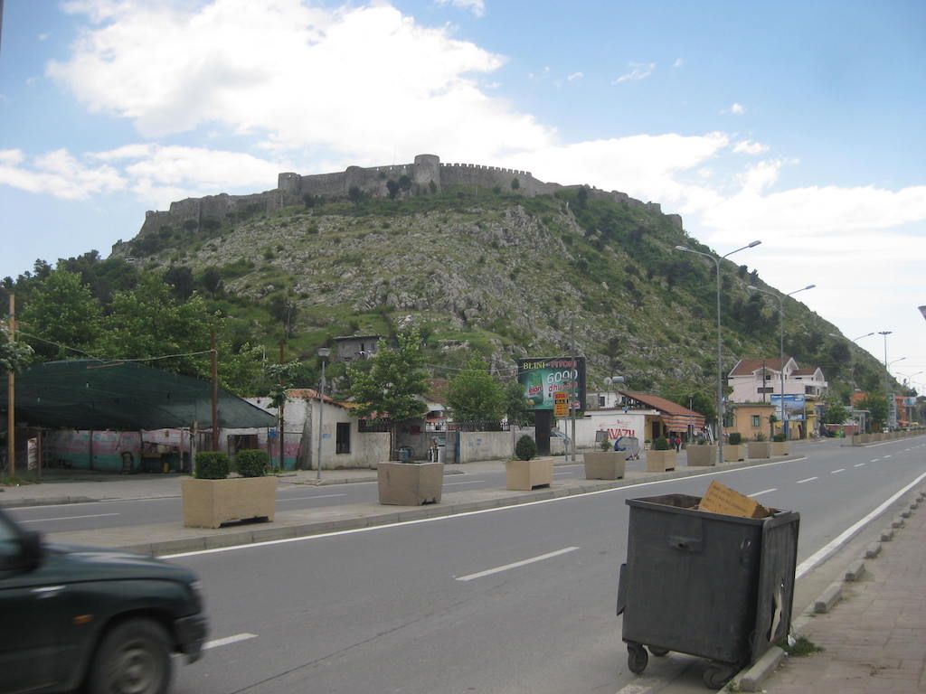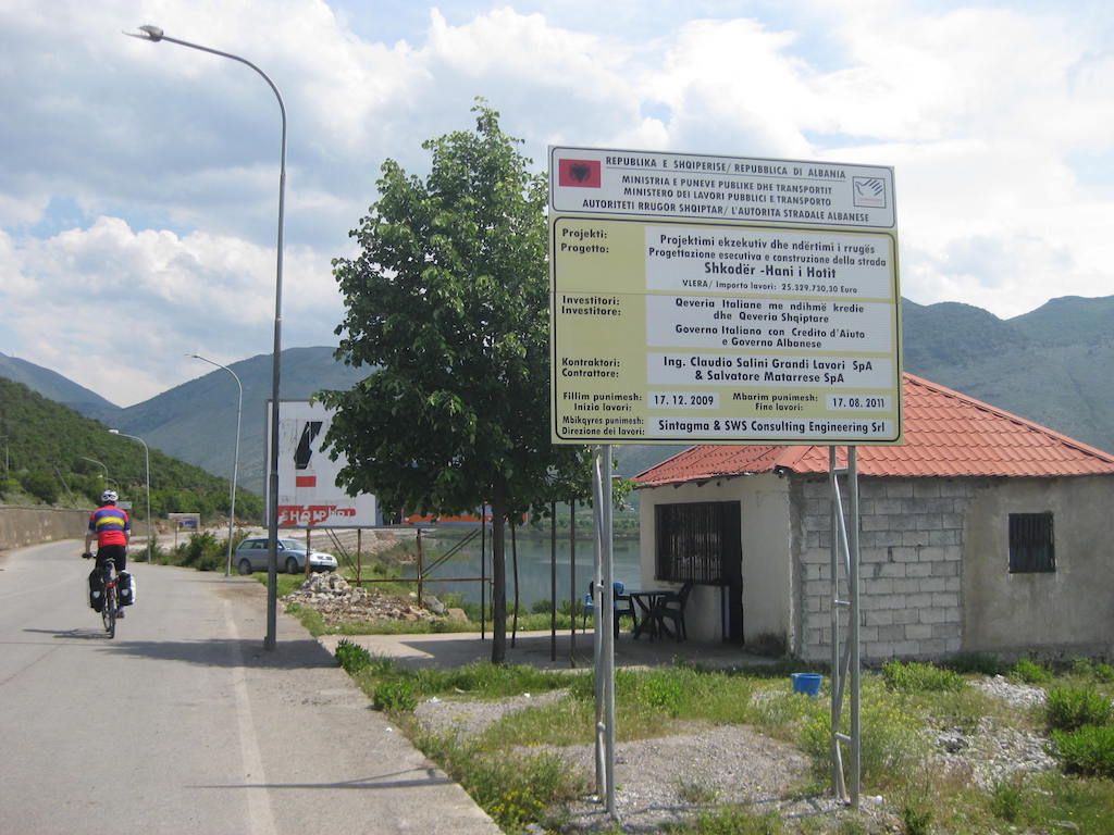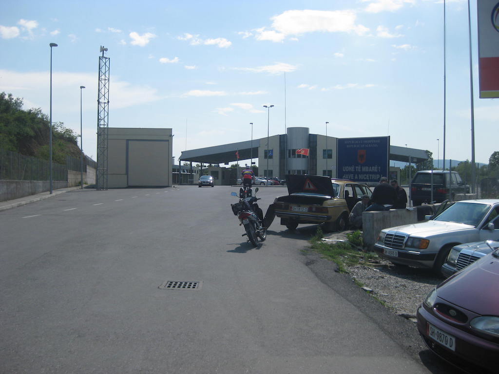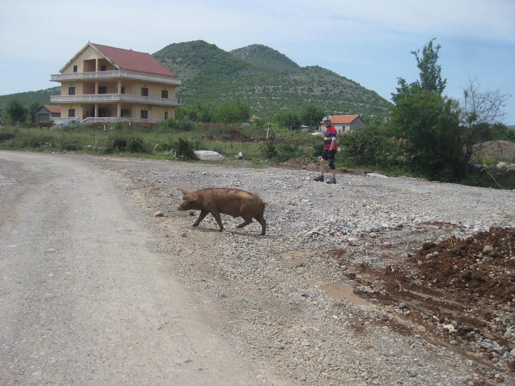 Die Einreise ist kein Problem. Den Pass vorgelegt, einen Stempel und schon sind wir drin. Drin im wahrsten Sinn des Wortes: Im Schlamassel !!! Schotterstrecke, die Straße wird neu gemacht, aber immer nur stückchenweise. Dafür ist aber die ganze Straße aufgerissen und Schlaglöcher hat sie auch. Schlaglöcher ? Die ganze Straße besteht nur aus Schlaglöchern. Das erste, was uns in Albanien begegnet, sind Schweine, die frei auf der Straße herumlaufen. Müll wird auch am Straßenrand gesammelt, nur wird er hier wohl nicht abgeholt und vergammelt und riecht. Unterwegs gibt es in einem kleinen Restaurant erst einmal etwas zu trinken. Cola ist immer gut für Radfahrer. Zucker gibt Energie. Als wir die nächsten beiden Dosen bestellen wollen, gibt es nur noch eine Cola, ausverkauft. Nach der kurzen Pause geht es weiter. Es folgte dann eine Mördertour bis nach Shkoder. Die Schotterpiste nahm kein Ende. Dieter meinte, die längste Baustelle Europas. Nur wurde an den größten Teilen nicht gebaut. Schotter mit kurzen Teilen Asphalt, der aber genauso tiefe Löcher aufwies wie die Schotterpiste. Eine harte Probe für die Räder und unser Material. Unterwegs immer wieder freundliche Menschen und fröhliche Kinder, aber auch viel Armut. Durch Shkoder sind wir dann nur durchgefahren. Es war aber teilweise schon ziemlich ungewöhnlich ( Schafmarkt mitten in der Innenstadt ), obwohl Shkoder auch einige schönere Teile hatte.
