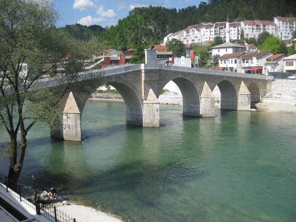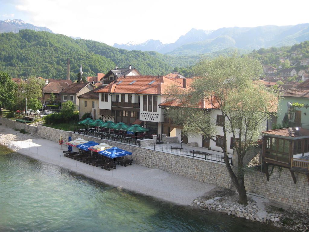 An unserem heutigen Übernachtungsort Konjic hatten wir keine großen Erwartungen gestellt. Wir sollten angenehm überrascht werden. Konjic ist eine schöne Kleinstadt mit der Neretva durch den Ort und einer alten Steinbrücke. Alles wird bzw. ist schon liebevoll restauriert. Im alten Ortsteil haben wir nach einem Tipp das Hotel Konac, direkt am Fluss, gefunden. Sehr gutes Quartier mit guter Küche. Zu empfehlen. Hier gibt es dann nach dem Duschen auf der Terrasse, erst einmal ein Bierchen. Danach geht es zur Ortsbesichtigung. Das Abendessen gibt es im Hotel Konac. Als Vorspeise einen türkischen Salat. Zu Hause würde man sagen, einen gemischten Salat mit warmen Putenbruststreifen und Schafskäse. Das ganze für 2 €. Preis – Leistung sind unschlagbar. Zum Steak gibt es Weißwein. Mit Blick in die Getränkekarte haben wir festgestellt, daß die 0,2 l Flaschen Wein umgerechnet um die Hälfte billiger sind als die gleiche Menge in 0,7 l Flaschen. Eigenartige Preisgestaltung. Also bestellen wir die Kleinen. Der Abend klingt mit einem Eis in der Altstadt aus.