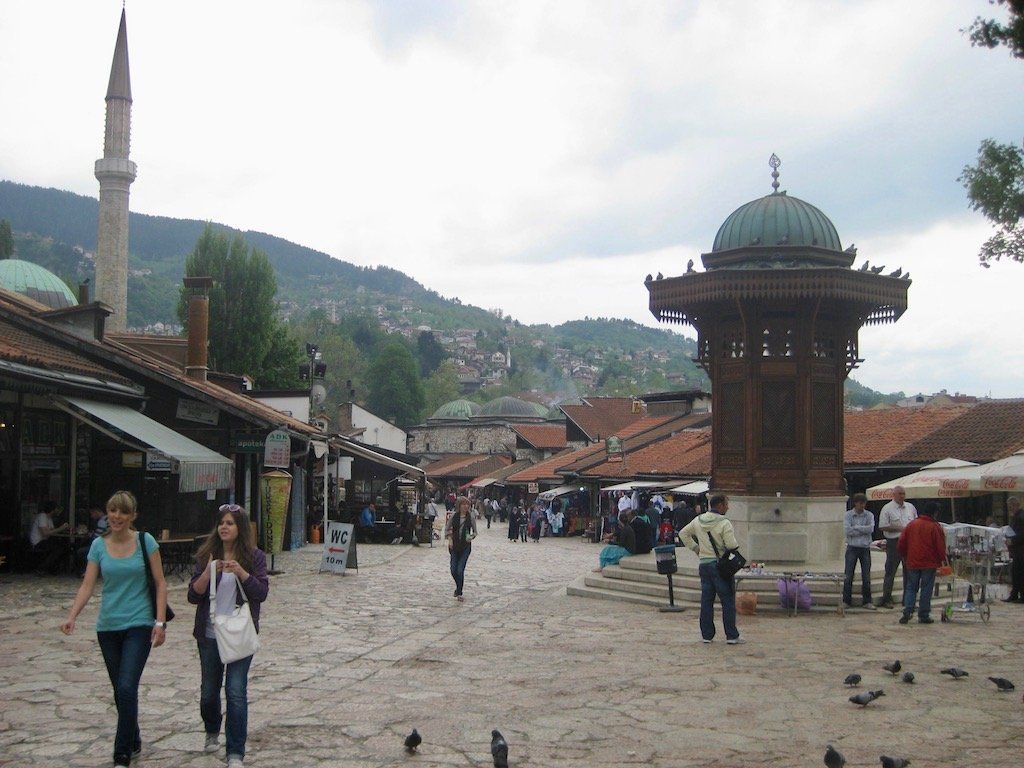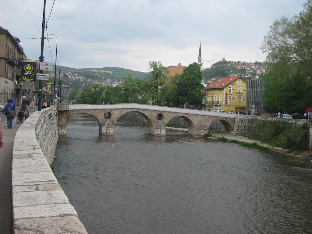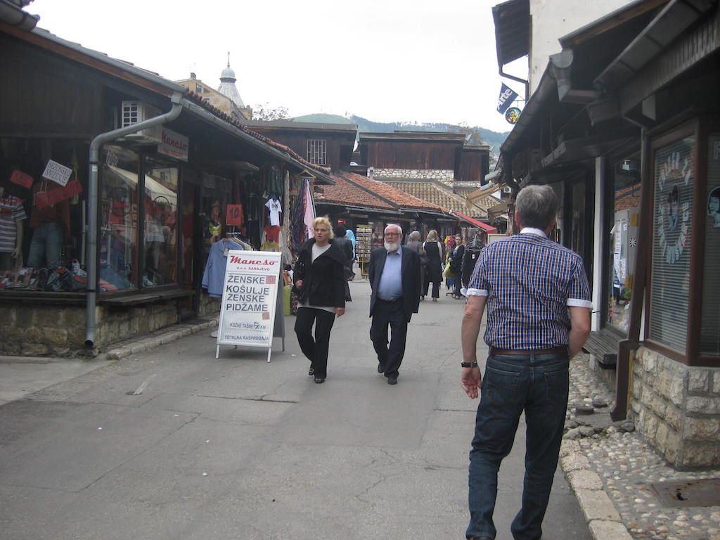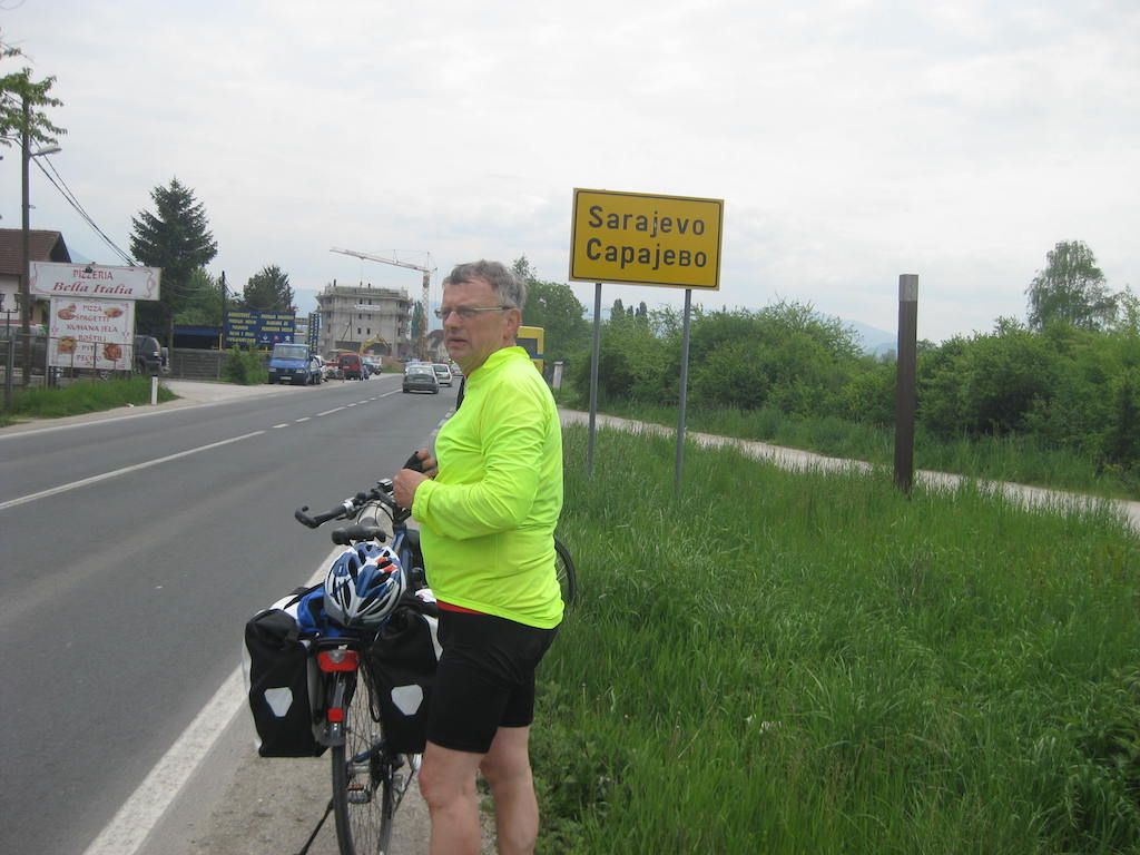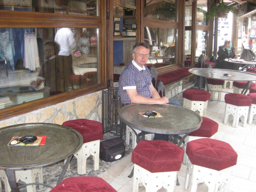Dann folgt der lange Tunnel vor Sarajevo. Hier wieder das übliche Spielchen mit dem Randstreifen. Der Randstreifen ist aber in einem so erbärmlichen Zustand, so dass wir immer wieder mal auf der Fahrbahn fahren müssen. Jetzt folgt eine lange Abfahrt, das ist immer das Schönste nach so einem langen Anstieg. Der weitere Weg nach Sarajevo erfolgt überwiegend eben. Dieter fährt vor, wird immer schneller. Ehe ich ihm sagen kann, dass wir laut GPS abbiegen müssen, ist Dieter an der Abfahrt vorbei und wir sind auf einer autobahnähnlichen Schnellstraße und werden von den Autofahrern mit lautem Hupen nicht gerade freundlich begrüßt. An der nächsten Abfahrt geht es sicherheitshalber lieber wieder runter. Das GPS berechnet die Route neu und führt uns durch einen noch von Kriegsspuren gezeichneten Vorortstadtteil mit Hochhäusern. Krasser können hier die Unterschiede nicht sein. Wir sehen Frauen im Tschador und Frauen im Minirock. Die unterschiedlichsten Lebensauffassungen liegen hier schon dicht beieinander. Dank GPS ist der Weg zum Hotel ( Hotel Latinski, direkt an der Latinskibrücke ) kein Problem. Dieses hatte ich auch im Internet mit guter Bewertung gefunden und vorgebucht. Auch hier hat sich die Bewertung im Internet bestätigt. Das Hotel liegt zentral gegenüber der Altstadt. Auf der anderen Brückenseite wurde 1914 der österreichische Thronfolger erschossen, was als Auslöser des ersten Weltkrieges bezeichnet wird. Eine Gedenktafel sowie ein Museum sind auch vorhanden. Nach den obligatorischen Sachen nach der Ankunft ( Duschen, Wäsche waschen ) geht es in den Altstadtteil. Dieser ist muslimisch geprägt, aber sehr schön. Man fühlt sich wie in eine andere Welt versetzt. Kleine Tee- / Kaffeehäuser, aber auch viel Andenkenkitsch. Uns gefällt es hier aber und es gibt ein muslimisches Abendessen. Den Abend lassen wir in einem Straßencafe in der Fußgängerzone ausklingen.