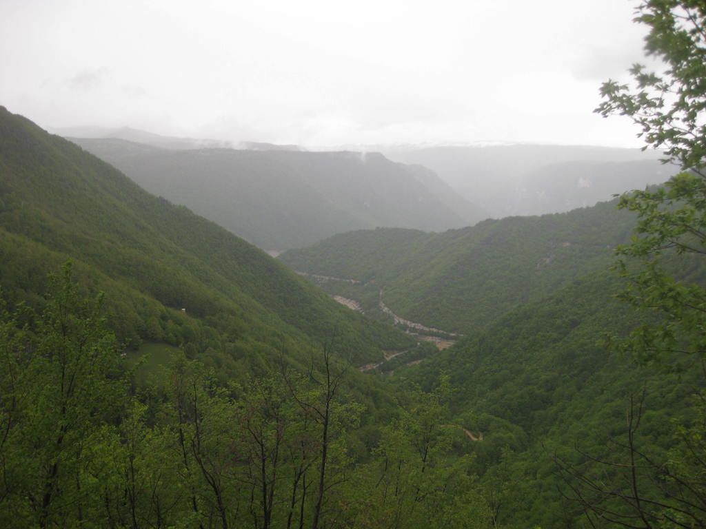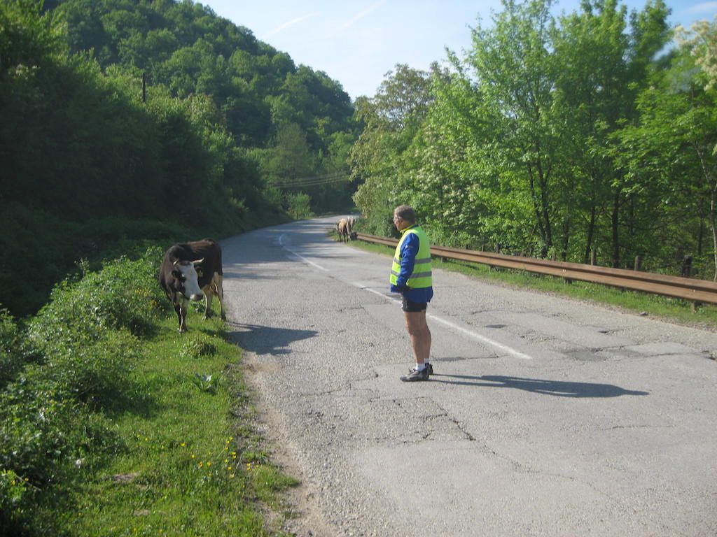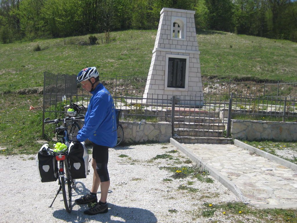 Dafür geht es jetzt ständig nach oben. Die Straße zieht sich bis auf eine Höhe von 1.166 M.ü.d.M. Auf dem Scheitelpunkt steht ein Kriegsdenkmal und hier ist erst einmal Mittagspause. Dabei leisten uns frei laufende Kühe Gesellschaft. Dann erfolgt eine grandiose Abfahrt durch das Tal der Bistrica, und 15 Kilometer vor Foca kehren wir dann erst einmal zum Mittagessen ein.