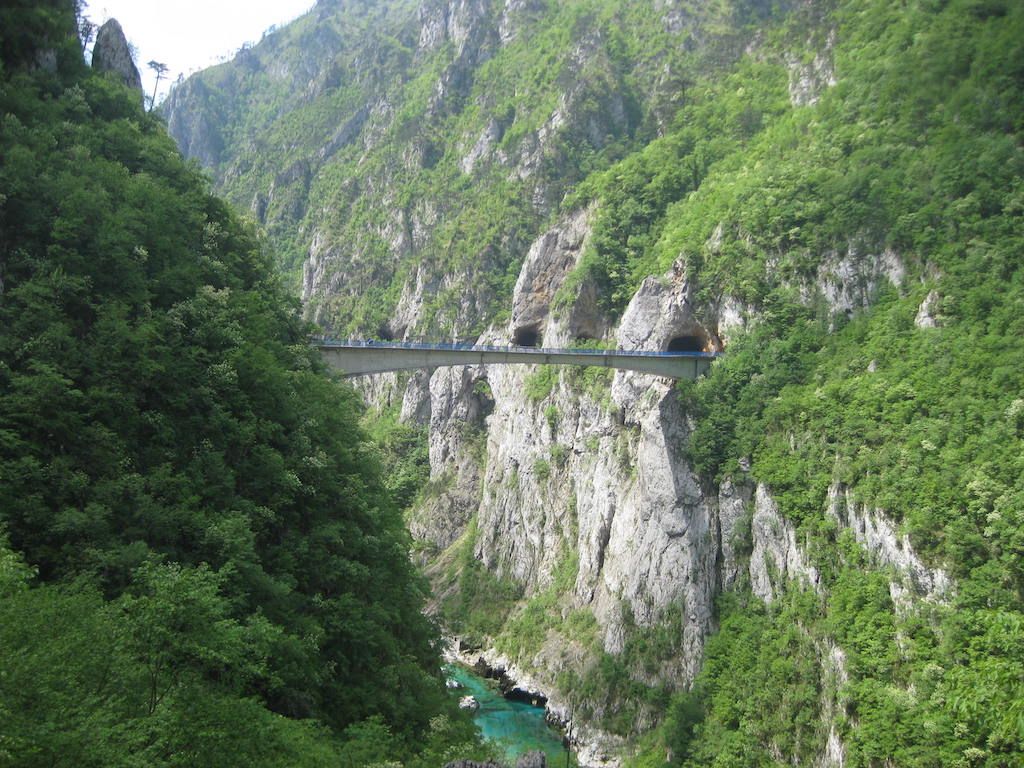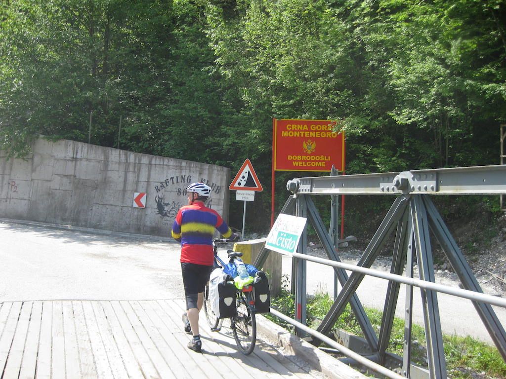Es folgen einige Anstiege in einer tollen Gegend entlang der Drina. Nach 2 Stunden haben wir die Grenze nach Montenegro erreicht. Wir sind die einzigen Reisenden und es geht über eine alte, mit Holzbalken ausgelegte Brücke nach Montenegro.