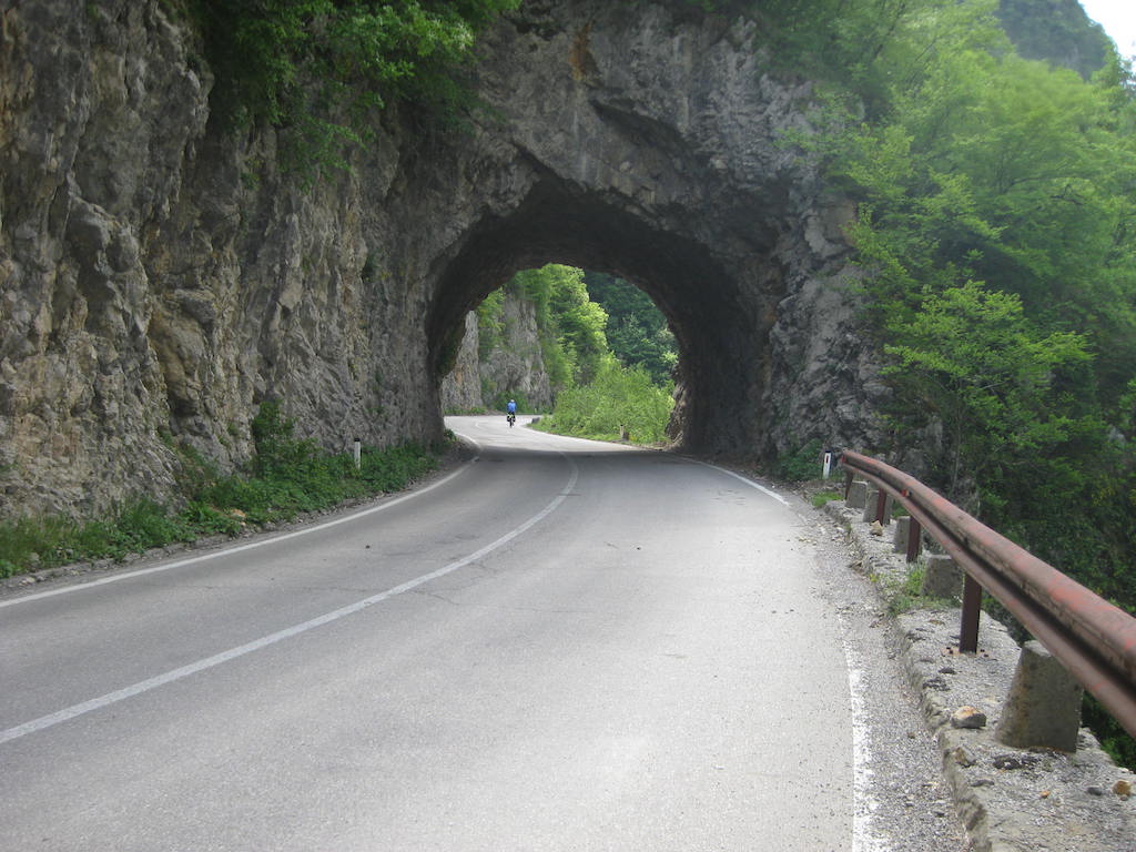 Dann folgt eine lange Abfahrt, ehe wir zu einer Brücke kommen, die das Tal überspannt. Wir fahren immer wieder durch Tunnel, da die Berge zu steil sind, um eine Straße teilweise daran entlang zu führen. Der Wind hat jetzt wieder zugenommen und bläst uns von vorne ins Gesicht. Teilweise haben wir Schwierigkeiten aus den Tunneln heraus zu kommen, da der Wind dort so stark reinbläst. Typischer Düseneffekt. Mitunter waren die Tunnel so dunkel, dass wir trotz super Beleuchtung an unseren Rädern zeitweise die Orientierung darin verloren haben. Zum Glück konnten wir uns dann wieder an der Leitlinie orientieren. Die Fahrt geht ganz schön in die Beine.