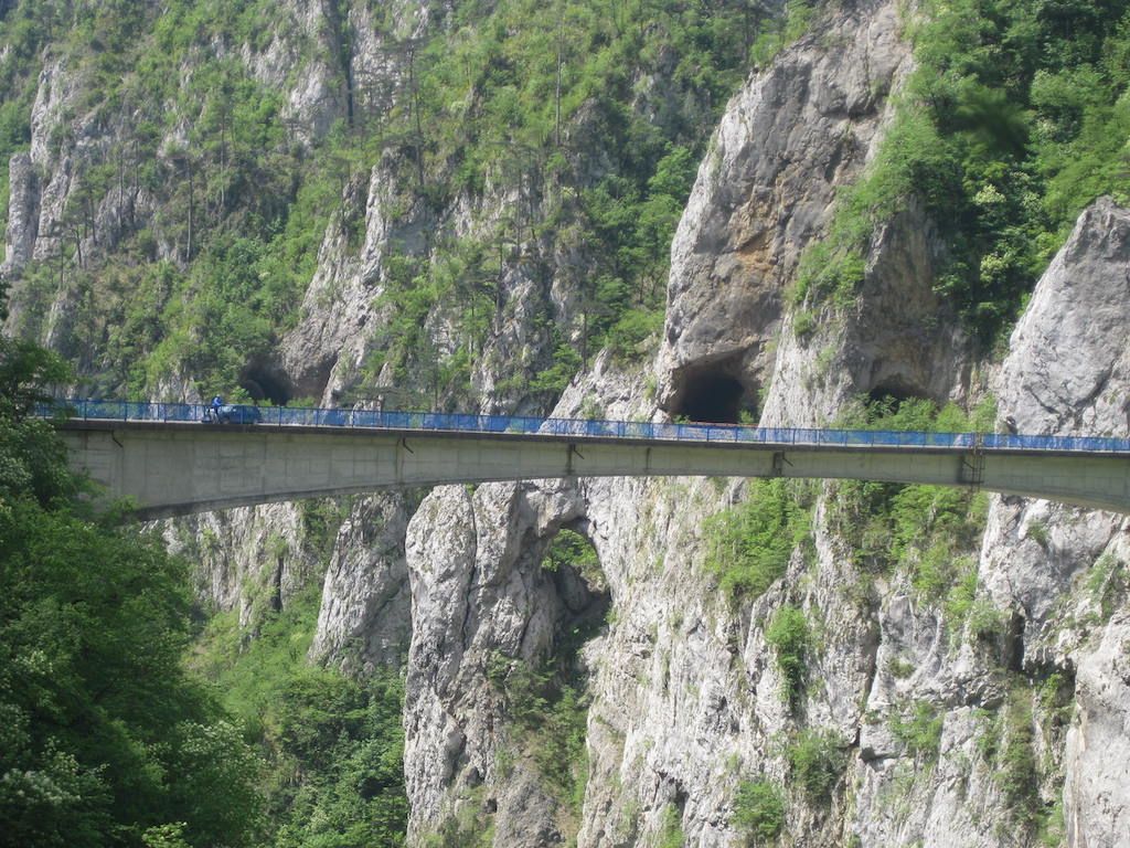 Die letzten Kilometer merken wir gar nicht mehr, ehe es über die Brücke nach Foca geht. Jetzt heißt es ein Quartier suchen. Privatquartiere sind nicht zu bekommen. Es gibt im Ort ein Hotel. Es ist auch das Einzige. Die Bezeichnung Hotel ist aber für diesen alten Kasten zu hoch gegriffen. 1 Stern wäre noch maßlos übertrieben. Es stammt wohl offensichtlich noch aus der alten Zeit, so sieht es auch aus. Angebot und Nachfrage regeln die Unterkunft hier ganz alleine !!! Zumindest ist das Zimmer einigermaßen sauber. Die Fahrt mit dem Lift nach oben ist schon abenteuerlich, man sackt beim Betreten erst einmal 10 cm durch. Dann flitzt der Fahrstuhl am offenen Schacht vorbei. Oben sieht es auch eher aus wie eine Abbruchruine. Auf den Balkon gehen wir lieber nicht zu zweit. Die Räder können wir in einem stillgelegten Seitenanbau abstellen. Dieter ist skeptisch, ob sie morgen noch da sind. Den Schlüssel behalten wir vorsorglich lieber selber. Den Ort Foca haben wir schnell durch. Nur ein Restaurant haben wir nicht gefunden. Wo gibt es jetzt Abendessen? Auf Nachfrage haben wir Glück und wir bekommen in einem Cafe eine Pizza. Viel mehr steht auch nicht auf der Karte. Na, besser als nichts !!! Nachdem die Sonne untergegangen ist, wird es hier in den Bergen sofort kühl. Das einzig gute an dem Quartier ist, daß man über das auf einem Stuhl stehende Fernsehen das 2. Deutsche Fernsehen empfängt. So können wir abends noch das Sportstudio gucken und zumindest die Meisterfeier vom unserem BVB sehen. Wir sind zu dem Entschluss gekommen, dass man Foca kein zweites mal im Leben sehen, geschweige hier übernachten muss.