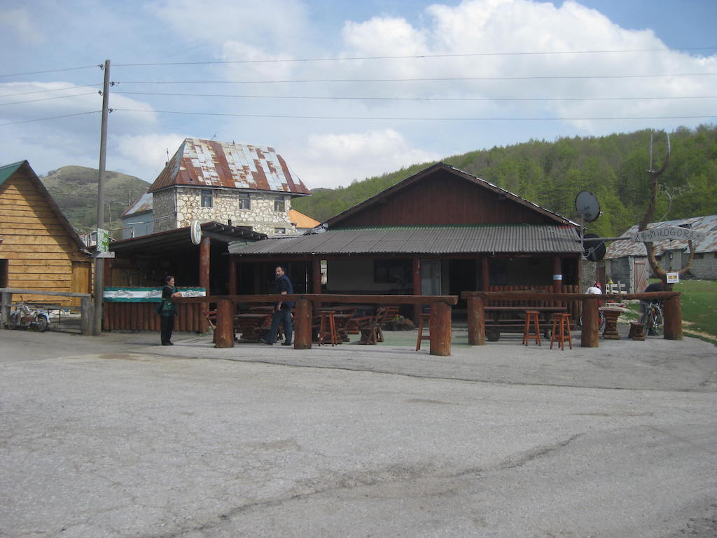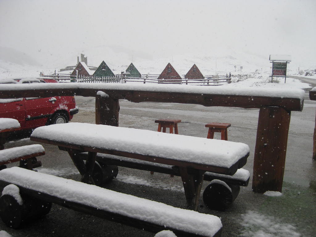 Wir werden gegen 7 Uhr wach. Es schüttet wie aus Kübeln. An Fahren ist in keiner Art und Weise zu denken. Es hat auch noch mehr abgekühlt, es sind nur noch 4 Grad. Also erst einmal Frühstücken in die Konoba. Es gibt gebratenen Speck mit Ei und Schafskäse mit Brot. Während des Frühstücks verändert sich das Wetter sehr schnell von Regen in Schneematsch und dann in Schnee, wobei der Schneefall immer dichter wird. Jetzt ist an Fahren schon gar nicht mehr zu denken. Wir sind auf 1444 M.ü.d.M. Den Pass wollten wir auf 1.908 M.ü.d.M. nehmen. Das können wir jetzt vergessen, da dort oben sicherlich noch mehr Schnee liegt und es serpentinenmäßig hoch und auf der anderen Seite wieder runter geht. Selbst die Abfahrt auf unserer Seite ist jetzt zu gefährlich. Die Straße ist nicht abgesichert und auch noch glatt. Auf Grund der Wetterlage haben wir uns dann entschlossen, noch einen Tag und eine Nacht in Trsa zu bleiben und morgen dann über Plucine und Niksic in Richtung Podgorica in Richtung Meer zu fahren. So verbringen wir den ganzen Tag in der Konoba, hier ist es zumindest angenehm warm, in unserem Holzzelt ist nämlich keine Heizung. Mit Essen und Trinken vertreiben wir uns die Zeit, einfach die Zeit totschlagen. Zu Lesen hatten wir nichts mit und im Fernsehen in der Konoba liefen den ganzen Tag und den ganzen Abend geistreiche Daily Soaps. Die Wirtin schaltete von einer zur anderen. Man, was kann ein Tag lang sein! Montenegro scheint nicht mein Land zu sein, da ich letztes Jahr bereits bei Regen zwei Tage in Tivat festgesessen habe. Ein paar Einheimische waren auch den ganzen Tag in der Konoba. Deren bevorzugtes Getränk war Slivovice. Bei der Menge, die sie tranken, hätten wir eine Alkoholvergiftung gehabt. Wir blieben so lange wie möglich in der beheizten Konoba. Um 22.00 Uhr war dann aber Schluss. Feierabend. Wir bekamen aber zumindest noch zusätzlich eine warme Decke. Beim Gang zum Holzzelt hatte es dann aufgehört zu schneien, war aber bitter kalt, knapp unter dem Gefrierpunkt. Um nicht zu frieren, zogen wir alle Sachen an die wir mithatten und legten uns dann unter die Decken. Es zog in der Hütte aber an allen Ecken und Enden. Es war in der Hütte nicht wärmer als draußen. Wir wünschten uns dann gegenseitig, dass wir morgen wieder wach werden und nicht irgendwann wie Ötzi aus dem Eis wieder auftauchen. Es wurde eine lange kalte Nacht.