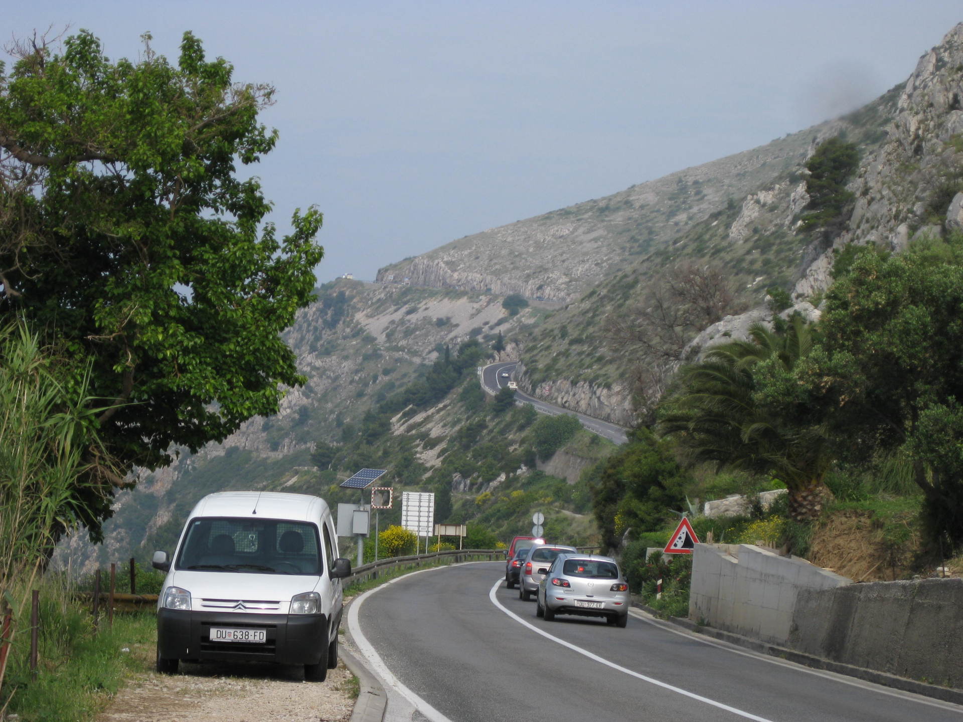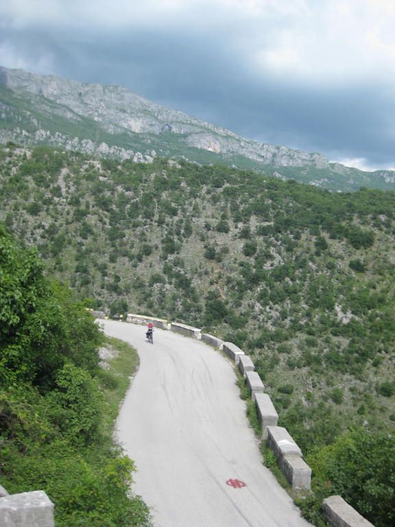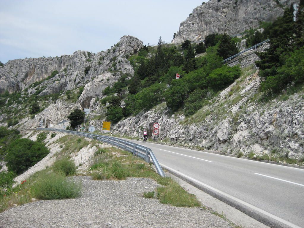 An der Abzweigung nach Trsa legen wir eine kurze Pause ein, ehe wir uns an den Anstieg machen. Hier müssen wir auf einer Strecke von 11 Kilometern fast 800 Höhenmeter überwinden, wobei der erste Teil erheblich steiler als der Letzte ist. Jetzt ist Schieben und Fahren angesagt. Es ist teilweise so steil, dass wir nach den Anstrengungen mit dem Wind am Ende unser Kräfte sind. Die Straße zieht sich gnadenlos nach oben. Vier Kilometer vor dem Endpunkt ist das Trinkwasser aufgebraucht.