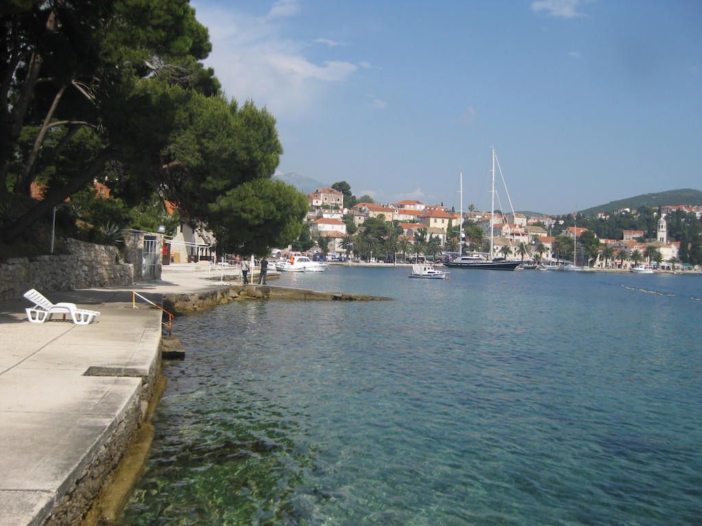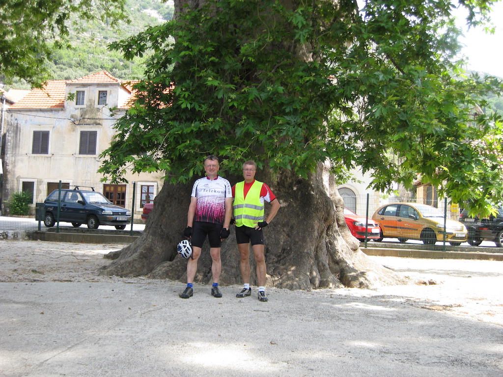Meter um Meter näherten wir uns der Grenze von Kroatien. Kurz hinter Herceg Novi fuhr Dieter ein Stück vor. Auf einmal bemerkte ich, dass mein Rad schwammig fuhr. Ich dachte zunächst an einen Speichenschaden. Bei der Nachschau stellte ich dann einen Plattfuß im Vorderrad fest. So ein Mist. Dieter war auch weg. Also rechts ran, die Taschen runter und das Vorderrad ausgebaut. Nachdem ich dann den Schlauch raus hatte, war Dieter auch wieder da. Es war ihm aufgefallen, dass ich nicht nachgekommen war. Den Ersatzschlauch eingesetzt und zusammen haben wir dann das Vorderrad wieder eingebaut. Ich sah allerdings nach der Reparatur aus wie ein Schornsteinfeger, zum Glück nur an den Händen. Der ganze Bremsdreck lag auf den Felgen und dem Vorderrad. Jetzt musste das gute Trinkwasser herhalten. So konnte ich nicht weiterfahren. Nur gut, dass wir genügend dabei hatten, so war ich anschließend wenigstens wieder einigermaßen sauber. Kurze Zeit später waren wir dann auch schon am Grenzübergang von Montenegro. Hinter der Grenze beginnt dann der Aufstieg zum Grenzübergang von Kroatien. Wir kommen bei dem schönen Wetter ganz schön ins schwitzen. Ohne Kontrolle lässt man uns Freischwimmer rüber. Wir sehen auf jeden Fall so aus, als wenn wir gerade aus dem Wasser kommen. Vor der Abfahrt erst einmal etwas ausschwitzen, bevor wir die lange Abfahrt in Angriff nehmen. Die Fahrt nach Cavtat verläuft dann meistens auf ebener Strecke. Bereits um 12 Uhr sind wir in Cavtat. Wir nehmen das gleiche Quartier wie letztes Jahr. Die Vermieterin erkannte mich auch gleich wieder. So eine kurze Etappe tut auch mal ganz gut und wir haben auch mehr Zeit und noch ein bisschen Cavtat anzusehen. Nach einem Rundgang um die Halbinsel ( auf jeden Fall sehenswert ) ging es zum Friedhof auf den Berg, von wo man einen herrlichen Blick in die Bucht und auf´s Wasser hat. Den Abend lassen wir zuerst im Hafen und anschließend auf dem Balkon ausklingen.