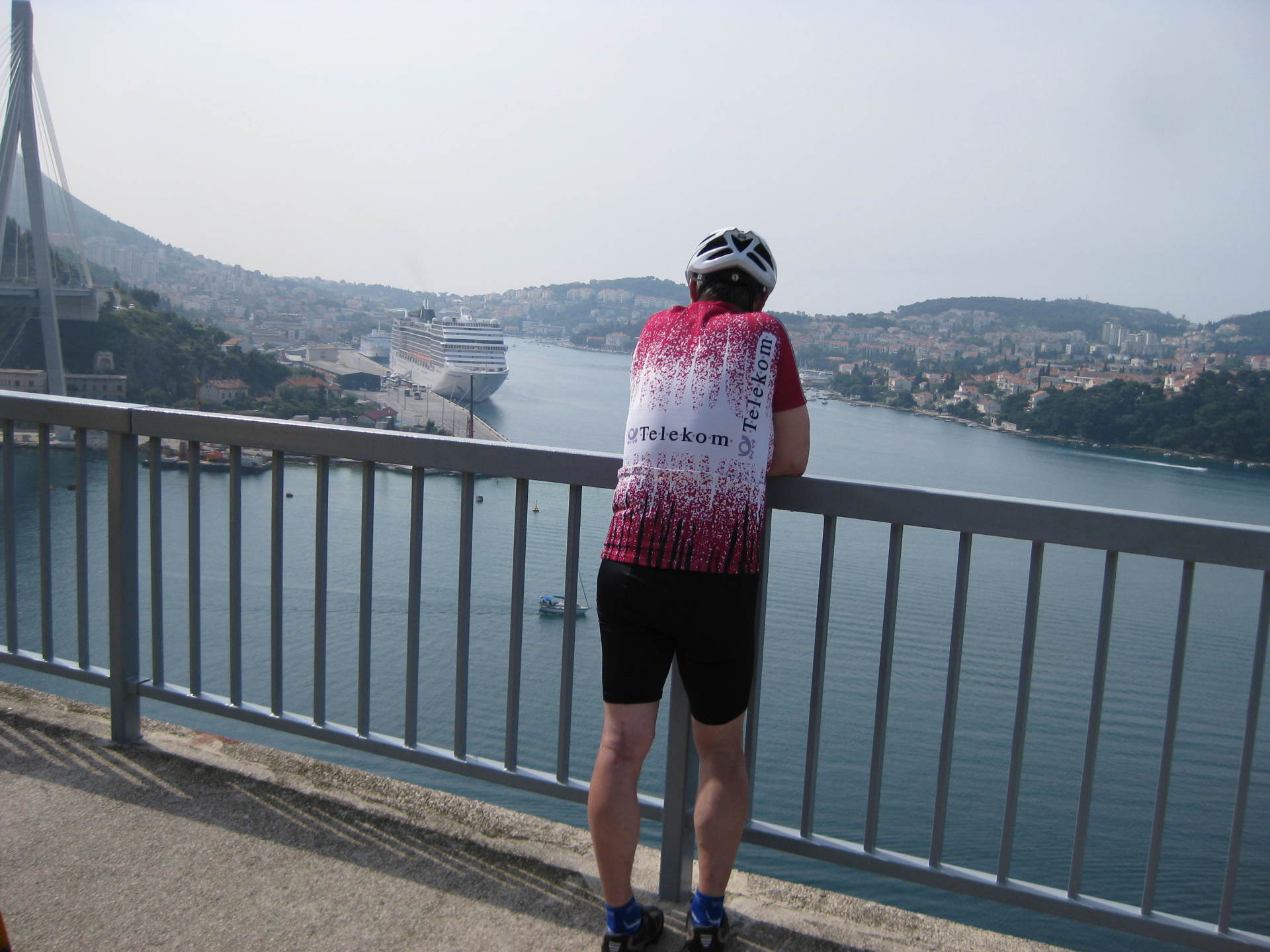 Um kurz nach 8 Uhr sitzen wir auf den Rädern. Bereits der Weg von Cavtat zur Magistrale geht kurz in die Höhe. Kurz darauf erfolgte auch schon der Anstieg nach Dubrovnik in einer Höhe von 211 Metern. Das waren jetzt aber nur noch kleine Hügel, nachdem was wir alles zuvor gefahren waren. Trotzdem ist gleichmäßiges Treten und Schwitzen angesagt. Immer wieder kleine Pausen, um den herrlichen Blick auf Dubrovnik zu genießen. Nur am Parkplatz kurz nach der Passhöhe halten wir uns nicht lange auf, hier kommen auf einmal 2 Busse und wir werden neben Dubrovnik auch Fotomotiv.