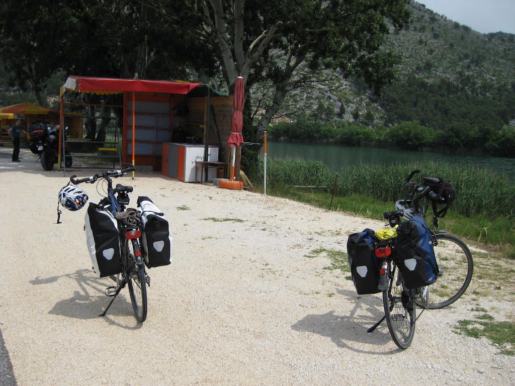Für uns folgt jetzt die lange Abfahrt ins Delta. Es ist drückend warm geworden und so machen wir eine Pause neben unserem Quartier von der Hinfahrt in Bacina. Es ist kurz vor 12 Uhr und der kleine Supermarkt hat auch noch auf. Wir sind die letzten Kunden, es ist Sonntag und um 12 Uhr wird geschlossen. Glück gehabt. Trotz der Sonne müssen wir aber wieder auf die Räder, der Aufstieg zu den Bacinska Seen folgt. Hier kommen uns immer mehr Wohnwagengespanne entgegen, die mit dem typischen gelben Kennzeichen. Wir merken, die Urlaubszeit beginnt, es wird für uns jetzt Zeit, die Tour langsam zu beenden. Die 2 Tage werden wir aber noch genießen.