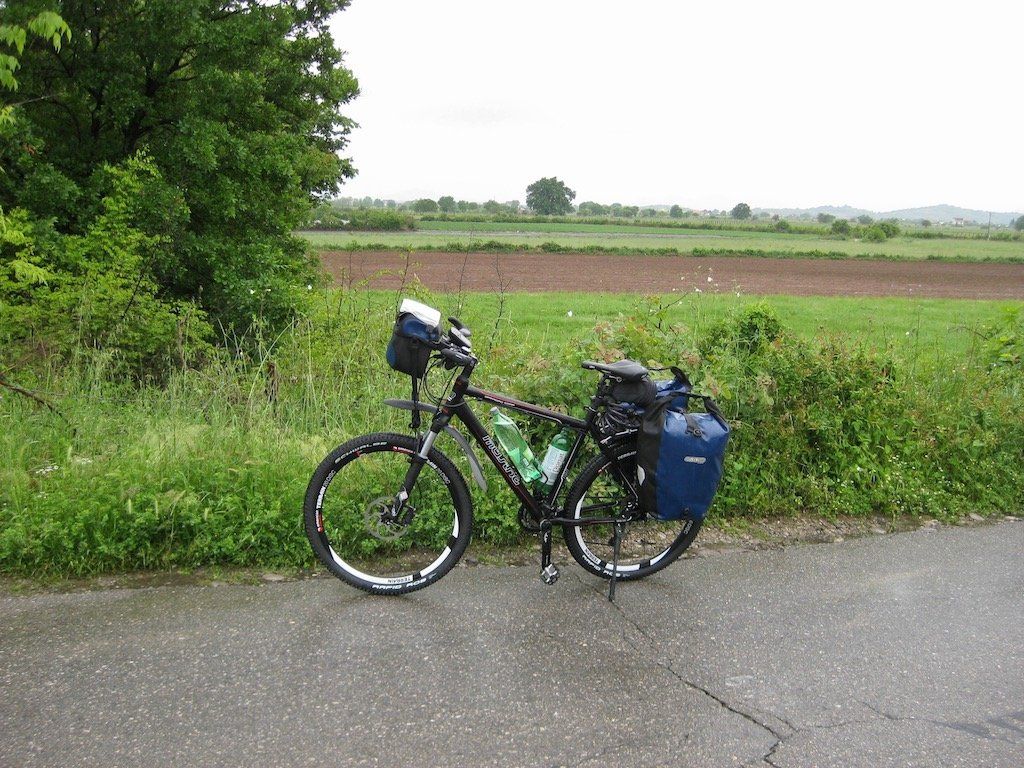 Bei der Abfahrt bemerke ich, dass der Hinterreifen wieder Luft verliert. Mist ! Offensichtlich steckt wohl noch ein Teil von gestern im Mantel. Ich hatte doch nachgeschaut und nichts gefühlt. Also wieder Gepäck runter und das Hinterrad ausgebaut. Tatsächlich, es steckte noch ein kleiner Metallstift im Mantel und hatte sich jetzt wohl durchgedrückt. Gestern konnte ich ihn nicht ertasten. Den Ersatzschlauch eingezogen und weiter geht’s. Hoffentlich nur eine Panne am Tag ! Einen Ersatzschlauch habe ich immer dabei, der wird dann abends immer geflickt, unterwegs ist das nicht so ganz einfach. Bislang immer Glück gehabt, noch keine zwei Plattfüße am Tag.