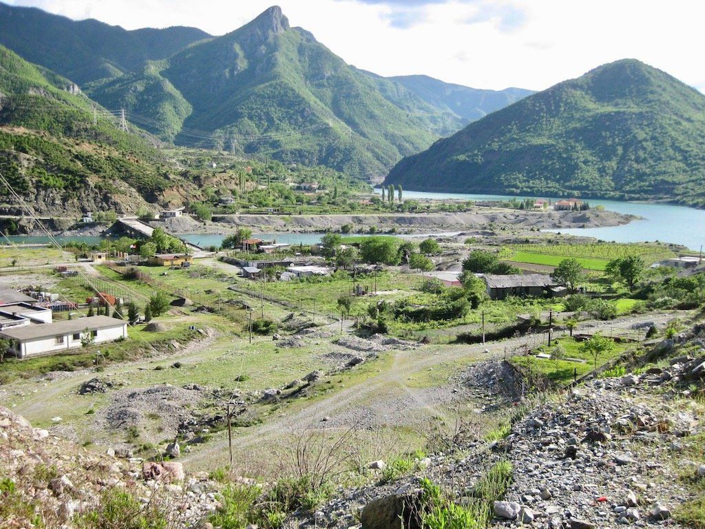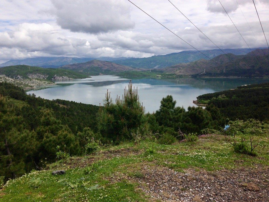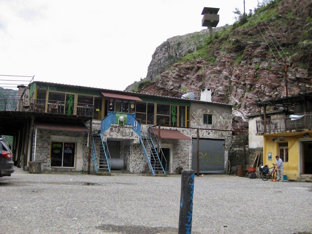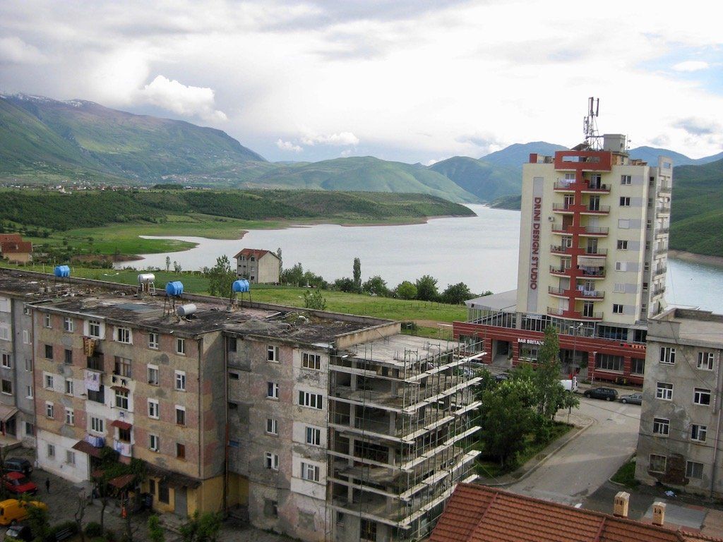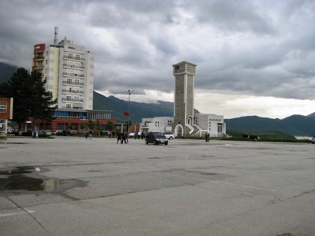 Die letzten Kilometer geht es über die neu gebaute Autobahn mit 6 % Gefälle bergab, bevor ich nach einem letzten Anstieg in Kukes ankomme. Kukes erreichte in Zeiten des Kosovokrieges Berühmtheit, hier waren bis zu 100000 Kriegsflüchtlinge aus dem Kosovo untergebracht. Die Grenze zum Kosovo ist nur ca. 15 Kilometer entfernt. Das alte Kukes ist im Stausee verschwunden, das neue Kukes wurde oberhalb des Stausees in typisch kommunistischer Form mit Plattenbauten wieder aufgebaut und hat so ca. 16000 Einwohner. Einfach nur eine hässliche Stadt in wunderschöner Gegend ! Ich steige im Hotel Amerika ab. Es ist wohl eines der moderneren Gebäude in Kukes. Jetzt erst mal raus aus den nassen Sachen und unter die heiße Dusche. Vor dem Abendessen noch eine Runde durch die Stadt, bevor es wieder zu regnen anfängt. Einen Absacker in der Hotelbar und dann zeitig ins Bett, morgen kommt der Tag mit den meisten Höhenmetern !