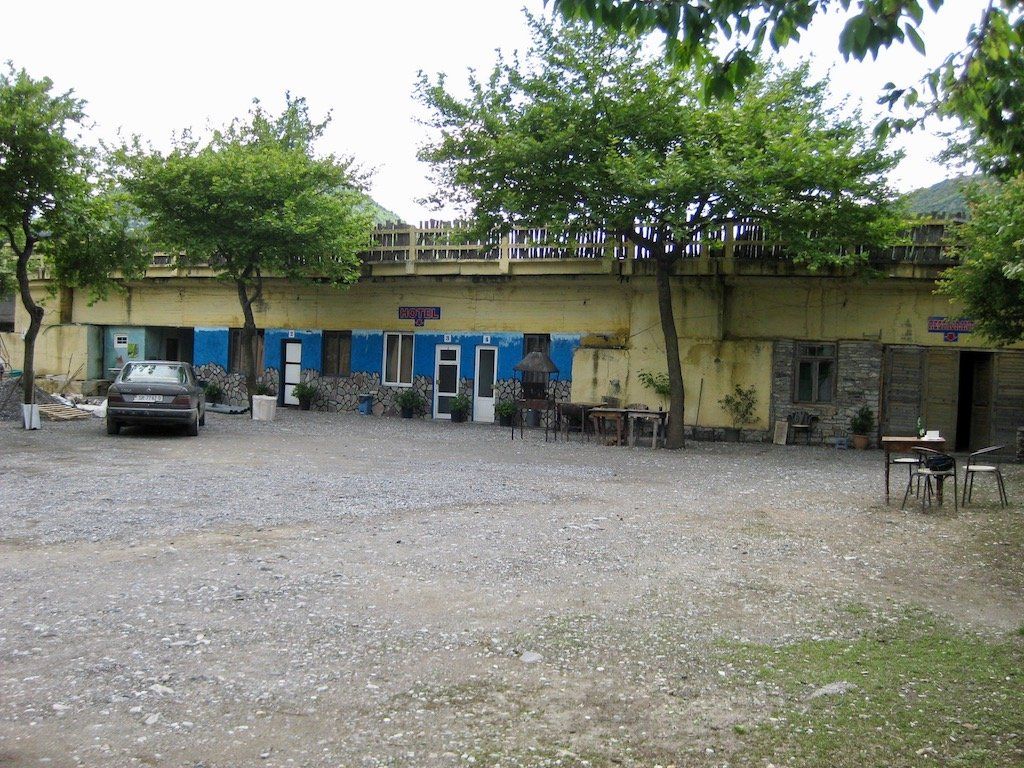 Ich will mir aber dann doch einmal das Hotel Varese anschauen. Diese Information hatte ich aus dem Internet. Hier ist jedoch niemand da, jedoch alles ist offen, man kann so rein gehen, sieht aber irgendwie unbewohnt aus. Dann erfahre ich jedoch, dass jemand angeblich ab 18.00 Uhr da sein soll. So lange will ich aber nicht warten. Also zurück zur grünen Wiese zum schönen rosa Hotel. Ich kann mir eins von fünf Mehrbettzimmern aussuchen und entscheide mich für das Zimmer mit nur einem Doppelbett darin. Na gut, für 10 € kann man auch nicht viel mehr verlangen. Es ist sauber, jedoch ohne weiteren Komfort. Mal sehen, wie viele Gäste noch kommen, ich bin mal gespannt. Nachdem ich mich häuslich eingerichtet habe, auf zur Gemeinschaftsdusche und danach ein bisschen die Gegend erkunden. Viel ist nicht zu sehen, ein kleiner überschaubarer Ort ohne Besonderheiten. Außer zwei Cafes und dem Campingplatz gibt es hier nichts zu sehen. Ich schaue zumindest einmal nach, wo es morgen in Richtung Stausee geht und wo ich morgen frühstücken kann. Das geht am kleinen Cafe vor der Brücke und ist ab sechs Uhr auf. Super.