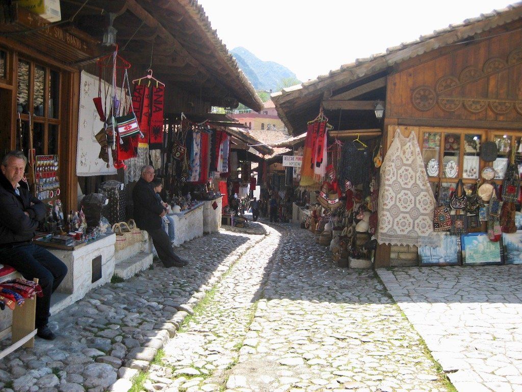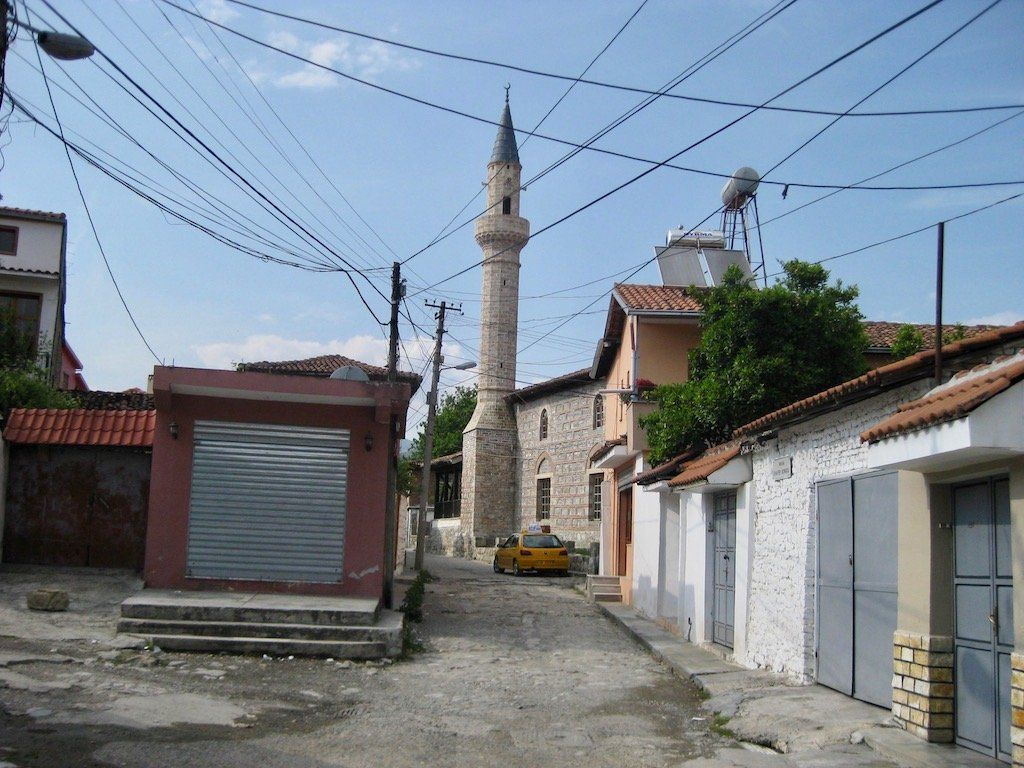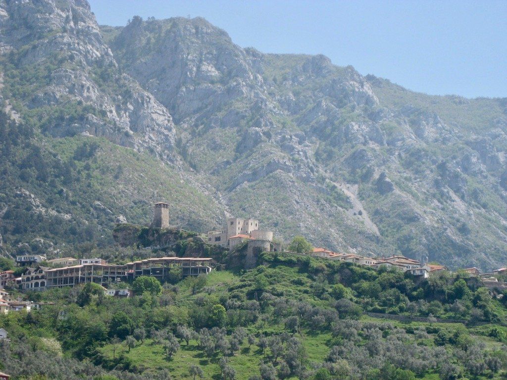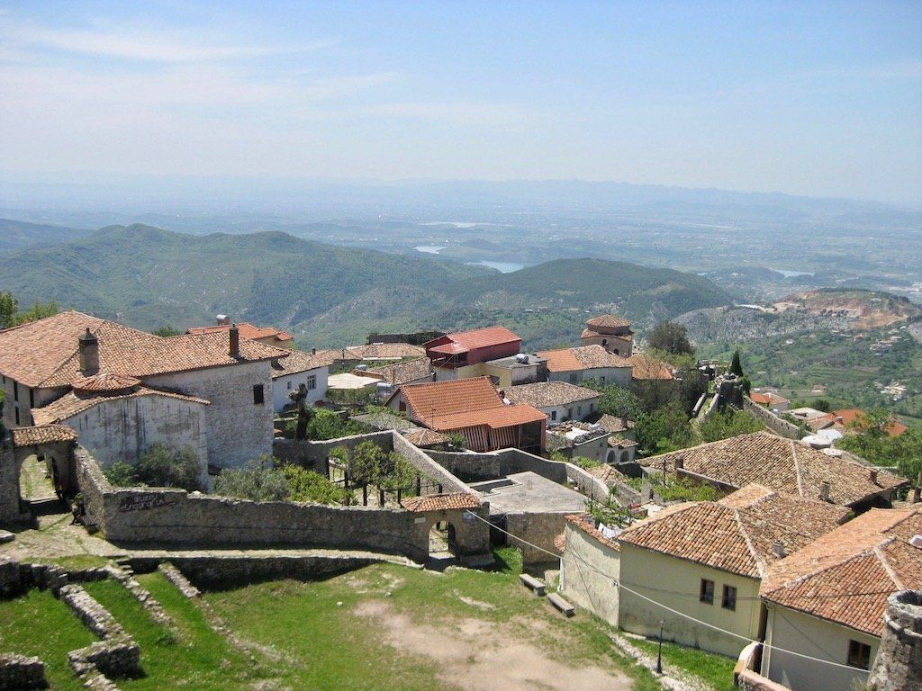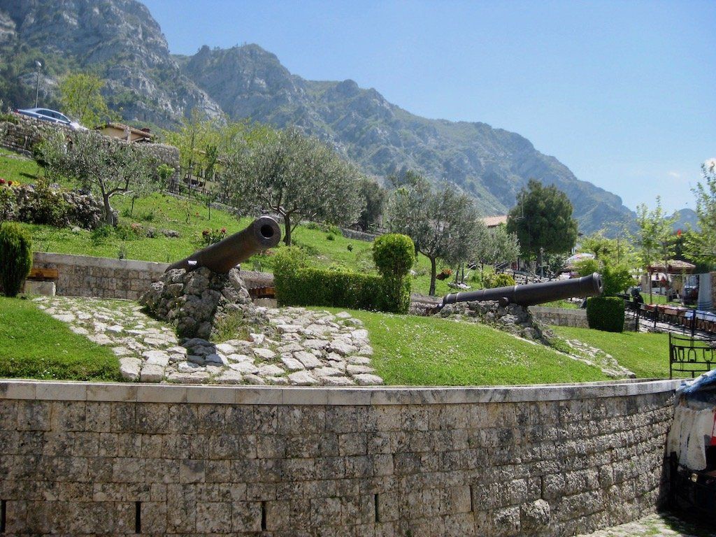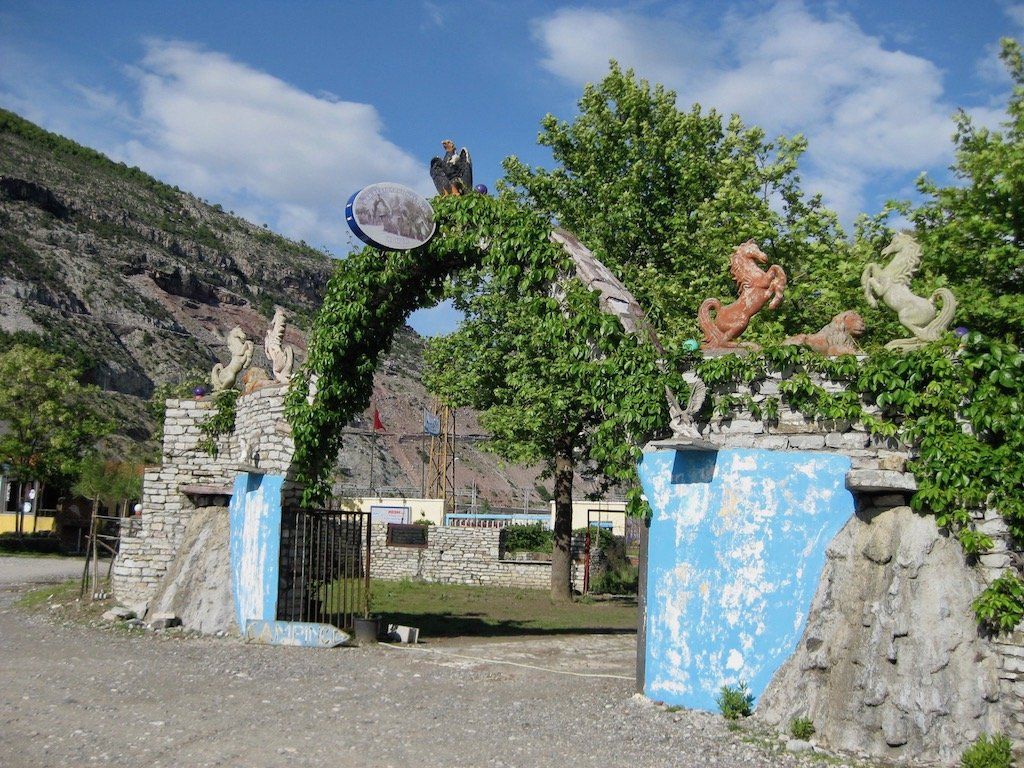 In Kame und anschließend in Fushe-Kruja ist richtig viel auf den Straßen los. Den Berg zum Museum nach Kruje lasse ich mich mit dem Sammeltaxi hochbringen. Hier wären 500 Höhenmeter auf 9 Kilometer zu überbrücken. Das will ich mir nicht antun, zumal ich anschließend noch nach Durres zum Meer möchte. In Kruje angekommen schaue ich mir das Skanderbeg – Museum an. Tolle Anlage in atemberaubender Gegend. Vor dem Museum ist der angeblich einzige touristische Basar in Albanien. Das Rad stelle ich im Innenhof der Museumsanlage ab.