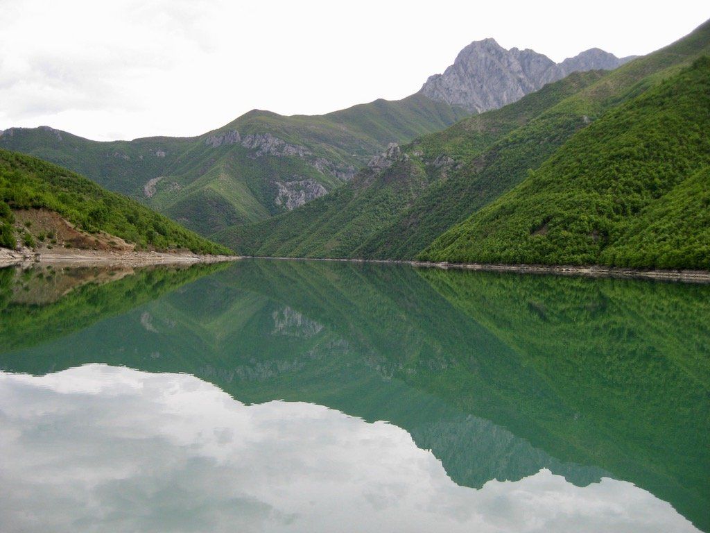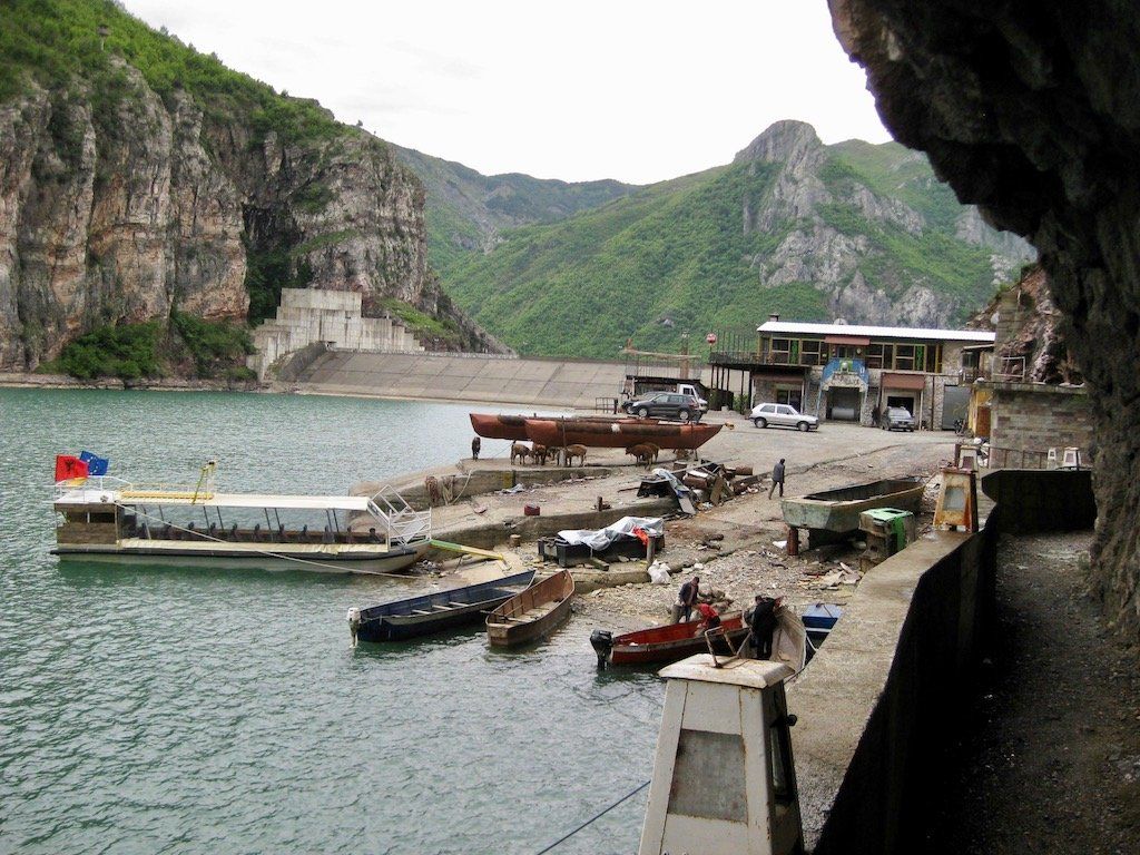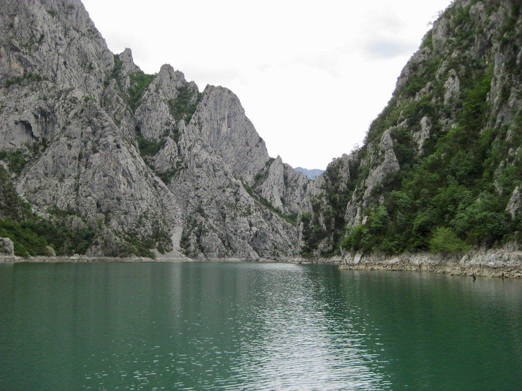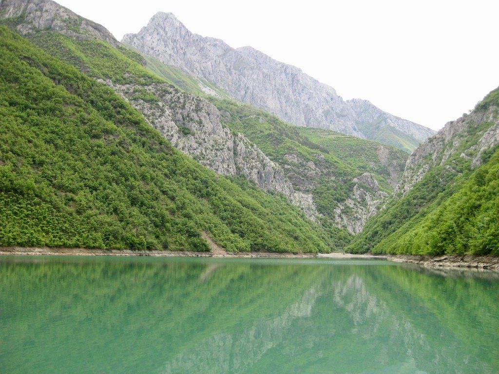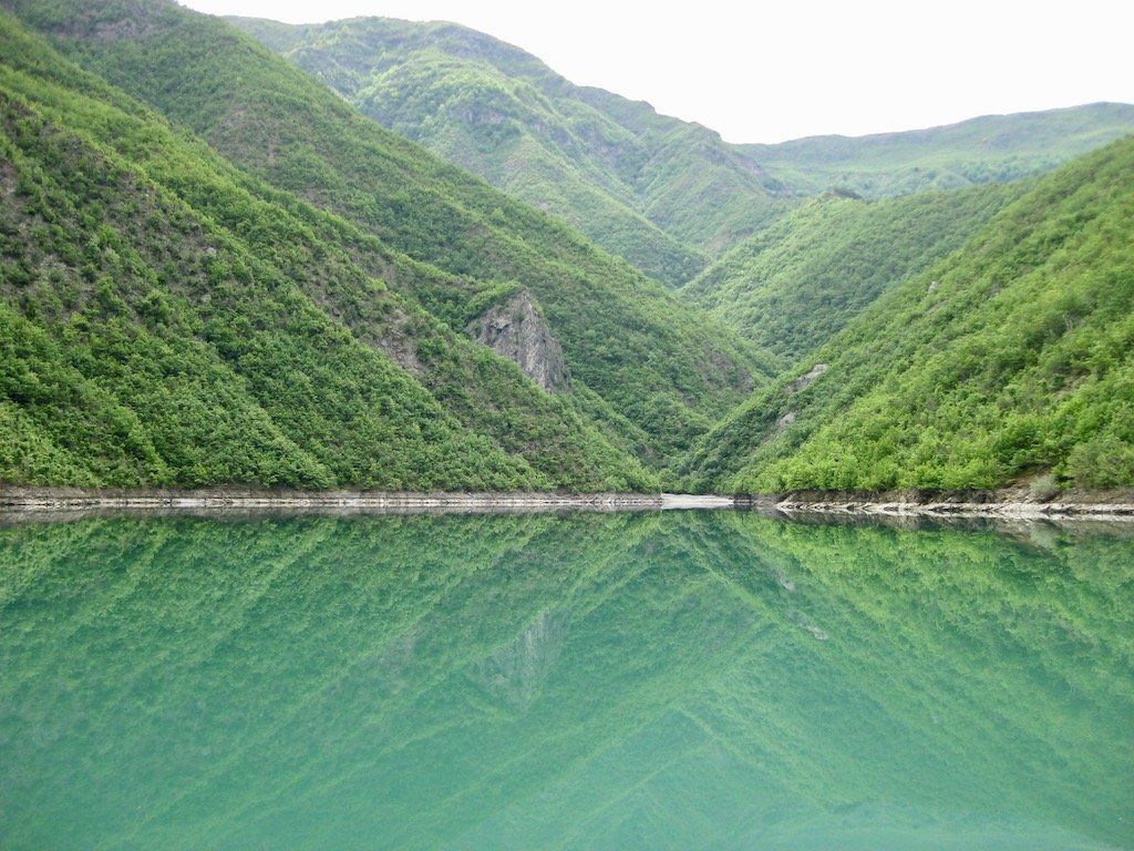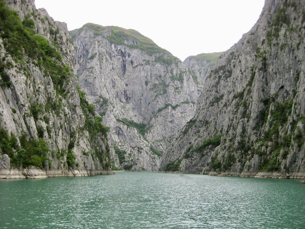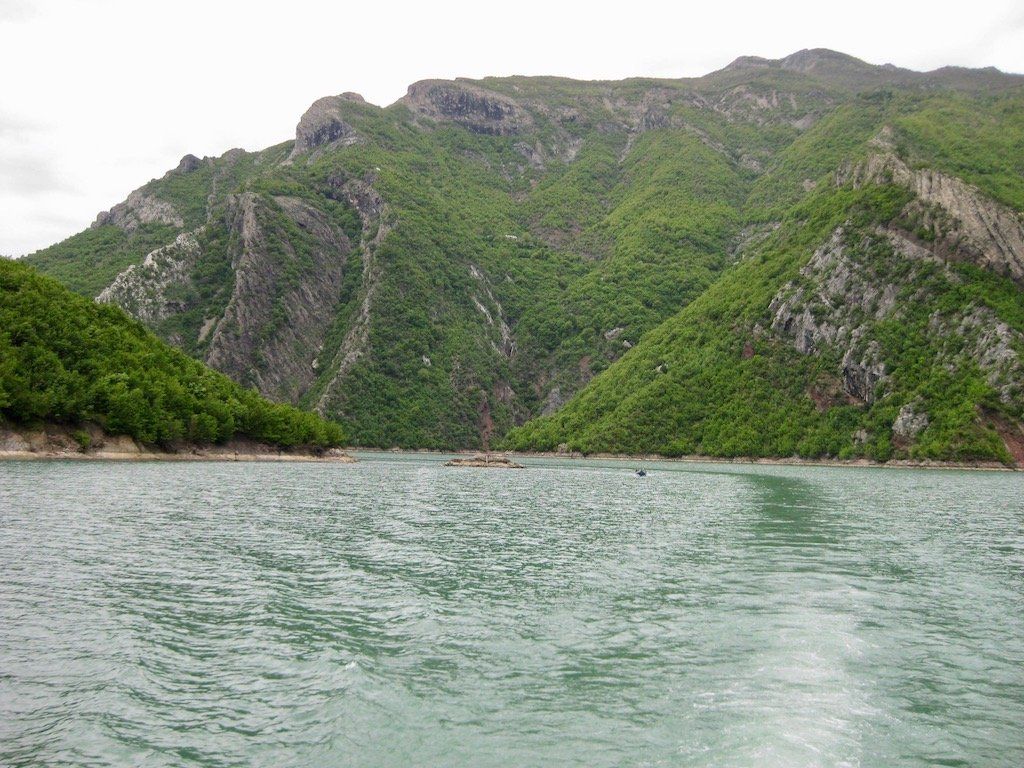 Es ist bewölkt, aber zumindest trocken. 14 Grad sind auf dem Wasser nicht gerade warm, also alle warmen Sachen, die ich dabei habe, anziehen. Dann geht’s auf das Oberdeck und ich genieße die Fahrt über den Stausee und durch die engen Schluchten. Eine grandiose Fahrt mit phantastischen Wasserspiegelungen. Nach 2,5 Stunden Fahrt erreichen wir den Endpunkt Fierze und werden ausgeladen.