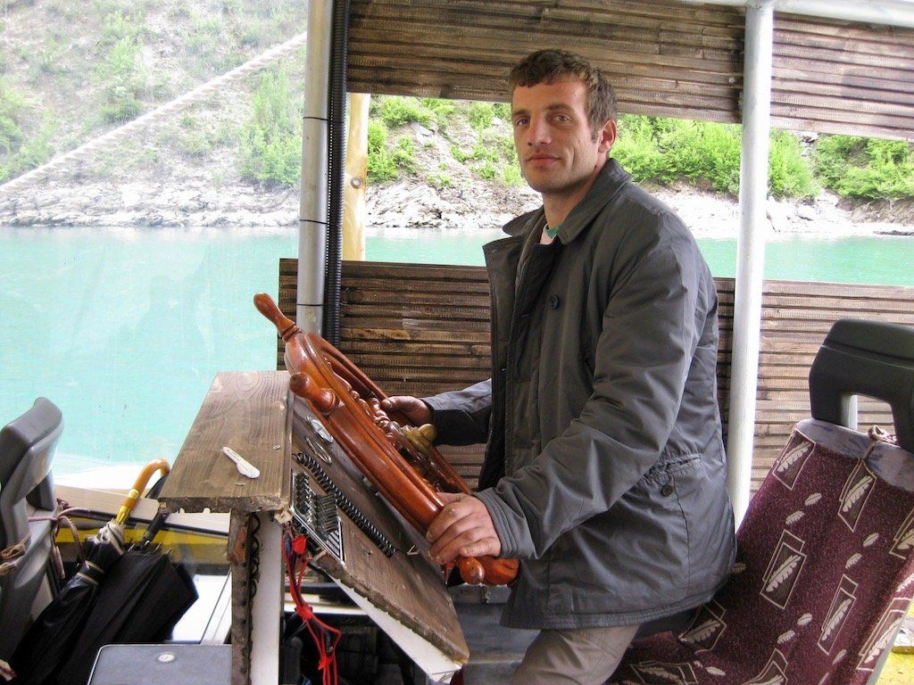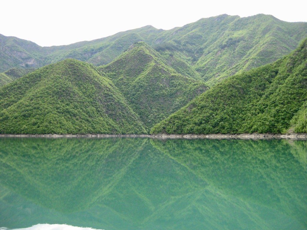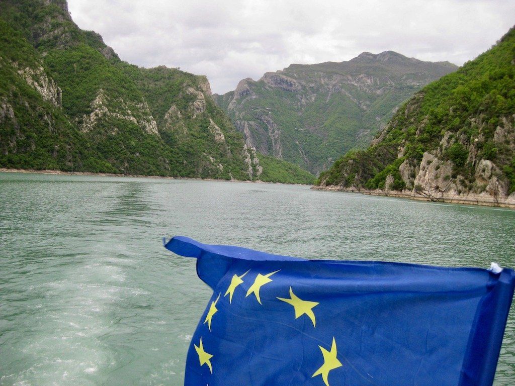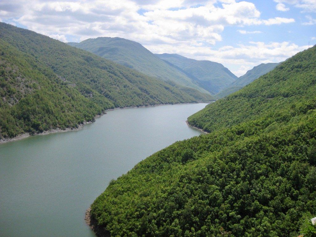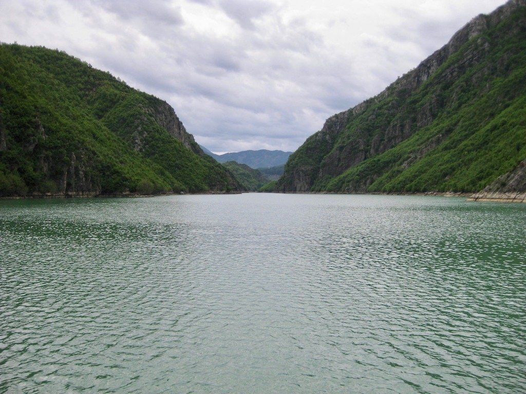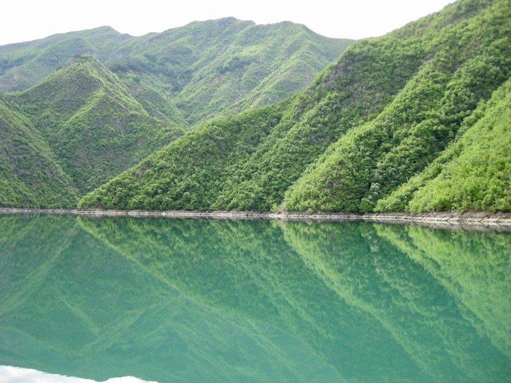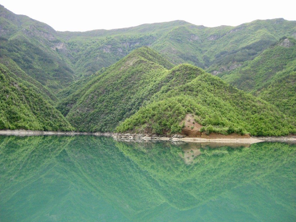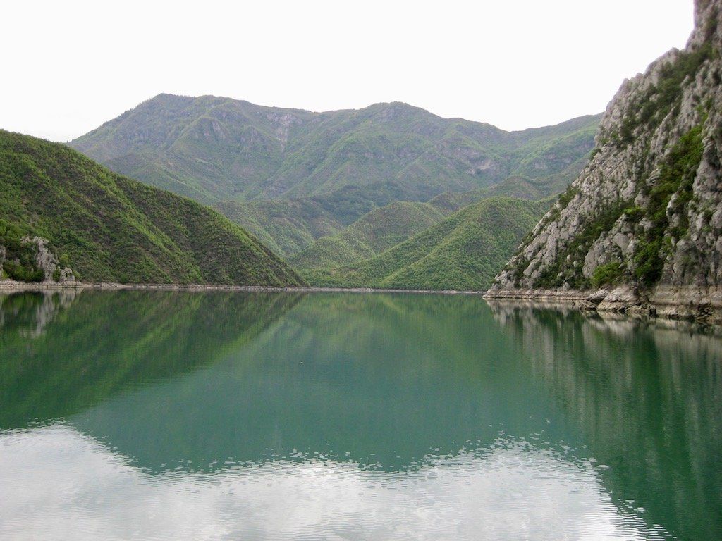 Es ist bewölkt, aber zumindest trocken. 14 Grad sind auf dem Wasser nicht gerade warm, also alle warmen Sachen, die ich dabei habe, anziehen. Dann geht’s auf das Oberdeck und ich genieße die Fahrt über den Stausee und durch die engen Schluchten. Eine grandiose Fahrt mit phantastischen Wasserspiegelungen. Nach 2,5 Stunden Fahrt erreichen wir den Endpunkt Fierze und werden ausgeladen.