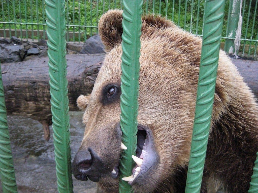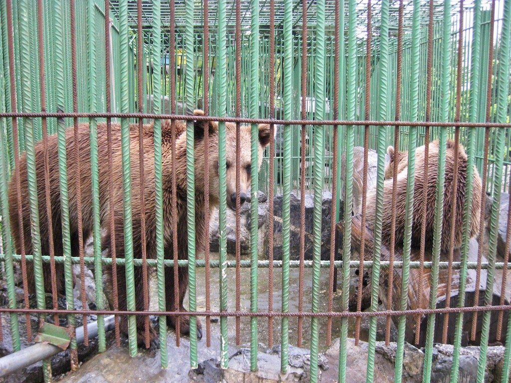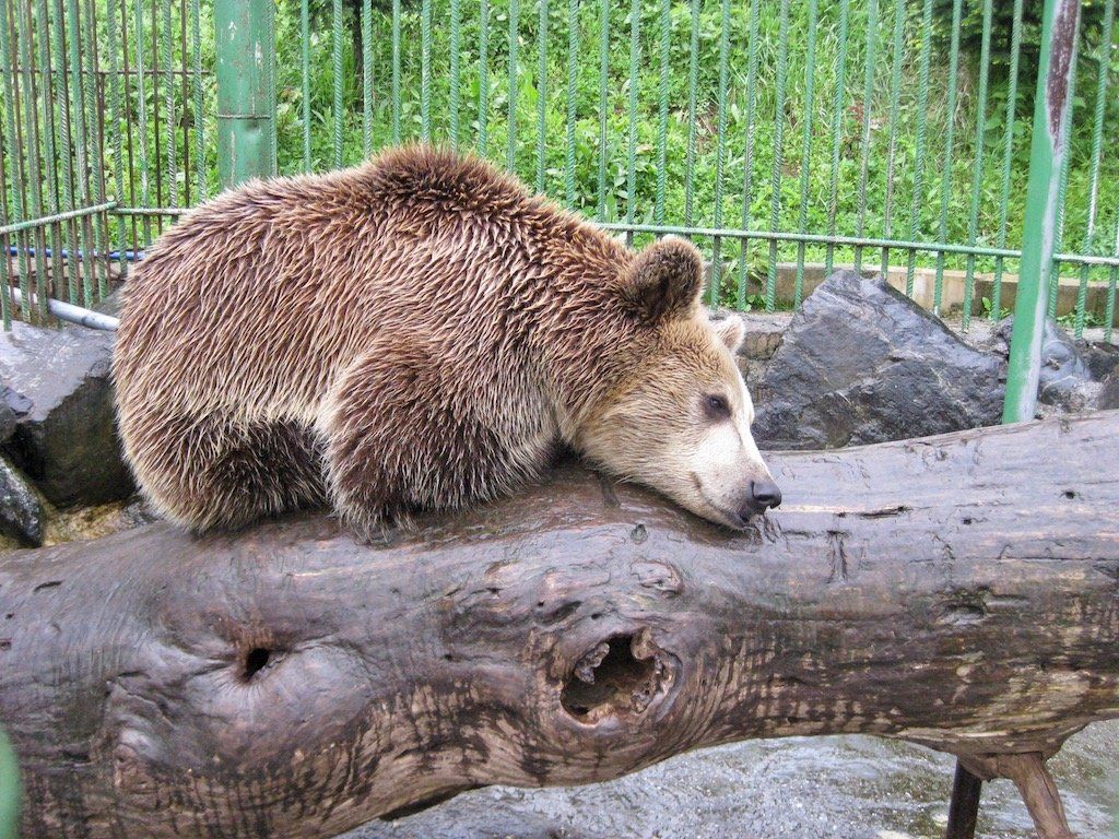 Kurze Zeit später werde ich von dem freundlichen Fahrer am Hotel „ Alpina „ mit einem kleinen Trinkgeld abgesetzt. Das Hotel liegt mitten in den Bergen. Ich hatte eh vor, bis dorthin zu fahren und dort zu übernachten. Die letzten Kilometer mit dem Sammeltaxi waren eine gute Entscheidung, zumal bis dorthin noch einige heftige Anstiege vorhanden waren und es ununterbrochen stark regnet. Jetzt erst einmal ins Zimmer und trockene Sachen angezogen. Um die Gegend zu Fuß zu erkunden, regnet es zu stark. Also auf zum Abendessen. Nachdem bei meiner Ankunft noch eine Gesellschaft im Restaurant war, bin ich nun mit den Kellnern alleine. Zum Abend hin kann ich dann doch einmal kurz vor die Haustür und sehe, das neben dem Parkplatz 2 Bären in einem Käfig gefangen gehalten werden. Muss das sein ? Es fängt dann noch stärker an zu regnen, hoffentlich geht das morgen nicht so weiter !