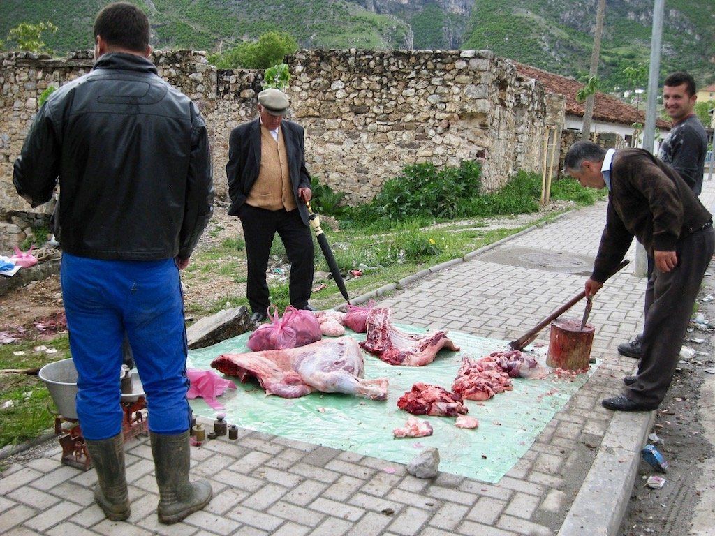 Im Hotel war es ziemlich laut, offenbar eine Gesellschaft, die lange gefeiert hat, die Nachtruhe war dementsprechend kurz. Nach einem guten Frühstück breche ich gegen 08:45 Uhr auf. Es ist trocken, aber ziemlich windig und extrem kalt. Der Wind kommt natürlich von vorne und mein Tachometer zeigt mir 6 Grad Außentemperatur an. Es geht am Flughafen vorbei wieder in die Berge. Der Aufstieg nach Bicaj ist extrem steil. Oben angekommen erst mal einen Blick zurück. Hier hat auch eine Fleischerei auf der Straße geöffnet. Ich schaue mir den Verkauf an und erhole mich erst einmal von dem Anstieg. Hier bin ich schon völlig durchgeschwitzt, trotz der kühlen Außentemperatur.