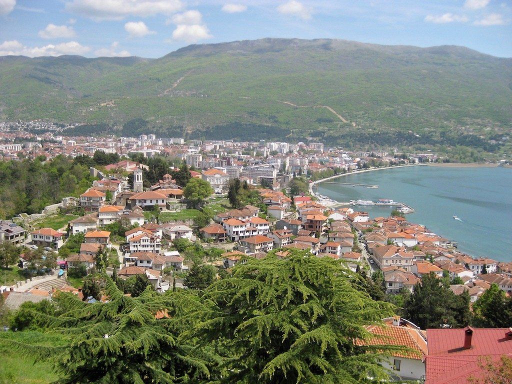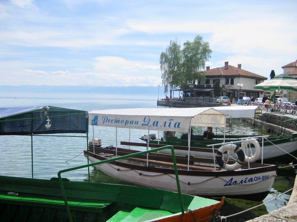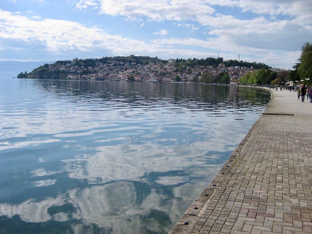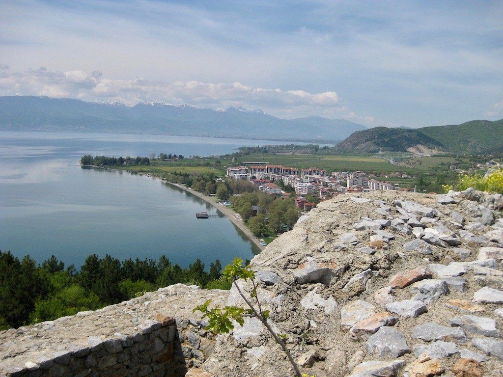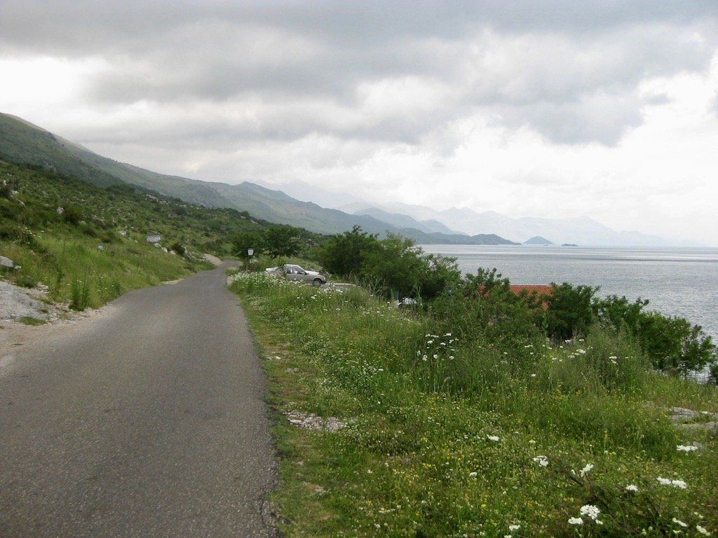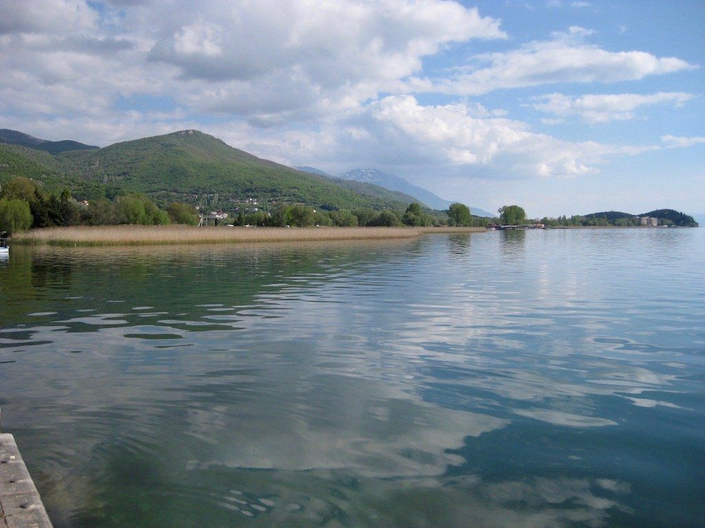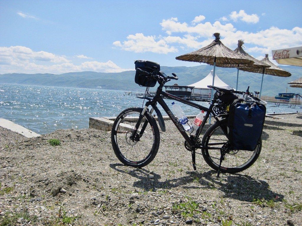 Ich breche gegen 08.20 Uhr auf. Albanien ist in dieser Gegend extrem hügelig und deshalb folgen noch einige Anstiege bis ich nach gut 1,5 Stunden die Grenze nach Mazedonien erreiche. Ab jetzt kann man auch die Anstiege wieder ohne große Probleme bewältigen. Es ist richtig warm geworden, zum erst mal ziehe ich kurze Radfahrsachen an. Die Fahrt verläuft jetzt zwar relativ eben, dafür habe ich im Tal entlang der Drin Gegenwind. Die letzten Kilometer nach Struga verlaufen auf einer fast endlosen langen Landstraße mit vielen LKW bevor ich den Ohridsee erreiche. Am Strand mache ich erst einmal eine Fotopause !