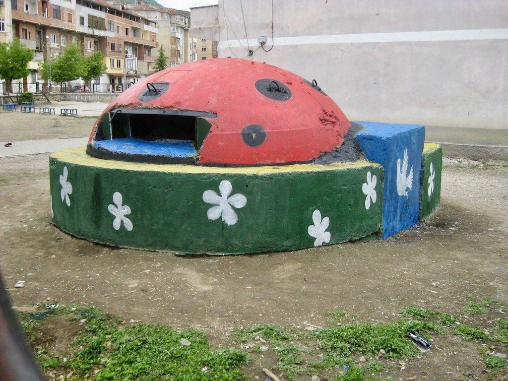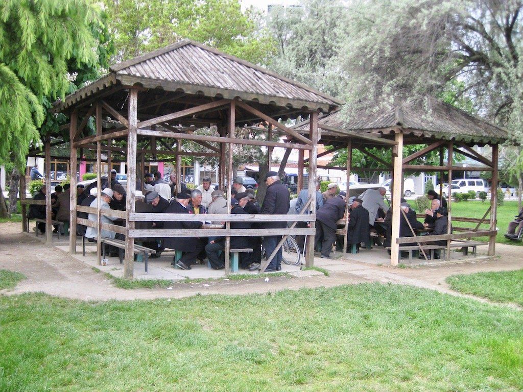 In Pogradec steige ich im Hotel Bambli an der Promenade ab. Für 20 € bekomme ich ein Dreibettzimmer für mich alleine. Jetzt erst einmal den Schlauch am Hinterreifen wechseln. Es steckt ein hauchdünner Metallstift im Mantel. Den Ersatzschlauch rein und den Anderen erst einmal auf dem Zimmer wieder geflickt. Es zieht zu und während des Stadtrundganges fängt es leicht an zu regnen. Eine typische albanische Kleinstadt mit 20000 Einwohnern und ohne touristische Höhepunkte. In den Parks wird mit großer Begeisterung Domino gespielt. Alte Relikte der Hodscha – Diktatur stehen mittleiweile als Spielgeräte im Kindergarten. Wie aber überall in Albanien, große Boulevards für die ehemaligen großen Aufmärsche. Der Regen wird stärker, hoffentlich ist es morgen wieder trocken !