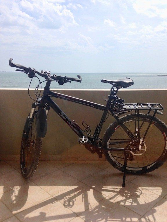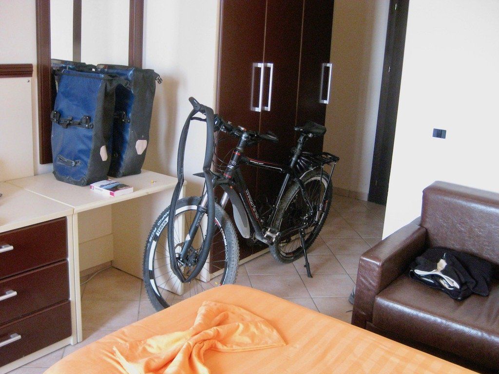 Ich bekomme ein Zimmer in der 4. Etage mit Meerblick. Das Rad darf ich auf dem Balkon lagern. Jetzt erst wieder einmal den Schlauch flicken. Das passiert auf dem Balkon in der 4.Etage. Wieder ein kleines Metallteil im Mantel. Diesmal aber ein anderes. Es ist nicht die gleiche Stelle, also neu reingefahren. Man, was geht mir das auf die Nerven. Bei den letzten Touren hatte ich nicht so viele Pannen. Zum Abendessen geht es in eine nahe gelegene Pizzeria. Im Hotel trifft dann noch eine Schulabschlussklasse ein, die machen Party bis in die Nacht. Natürlich auch in den Zimmern neben mir. Warum sollte es hier anders sein als bei uns ? Ich schlafe aber trotz des Lärms ein.