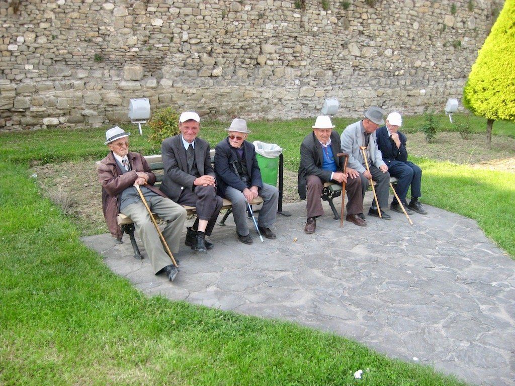 Ein paar Kilometer weiter die nächsten Radtouristen, ein Schweizer Pärchen ! Sie wollen nach Istanbul ! Ich erzähle ihnen von dem Briten, sie meinen, dass sie ihn wohl noch einholen und man schauen will, ob man ihm in der nächsten Stadt helfen kann. Wäre schön wenn es klappt. Auf Grund des zweiten platten Reifens in zwei Tagen schaue ich mittlerweile mehr nach unten zum Hinterreifen als mir die Gegend an. Hoffentlich hält er ! So macht das keinen Spaß, aber offensichtlich ist kein Teil mehr im Mantel, die Luft hält. In Elbasan steige ich im Hotel Universe ab. Für 25 € gibt es ein super Zimmer: Schlauch reparieren, Wäsche waschen und dann geht es zum Stadtbummel. Nette Stadt mit 78000 Einwohner, tollen alten Gebäuden, schöner alter Stadtmauer und netten fotogenen älteren Männern ! Morgen geht’s den Krraba - Pass gut 800 Meter in Richtung Tirana hoch ! Das kann ja heiter werden !