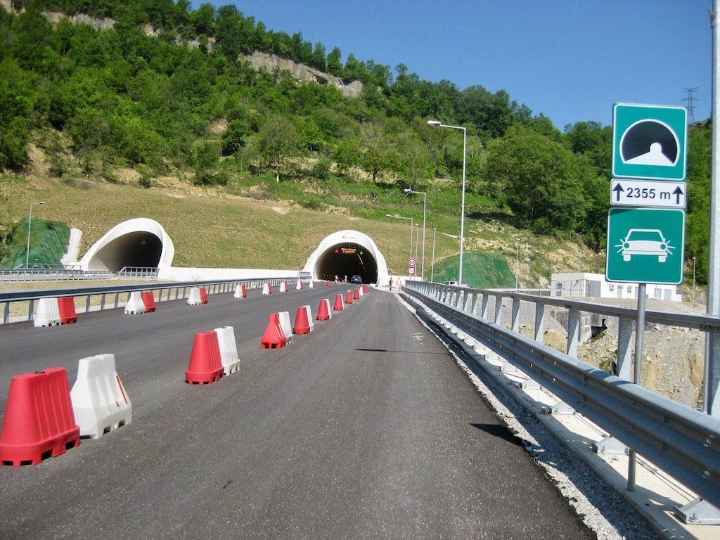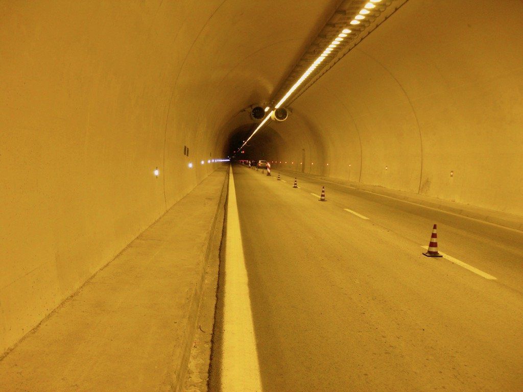 Dann stehe ich vor dem Tunnel: 2355 Meter lang !!! Ob das gut geht ? Vor dem Tunnel werde ich von zwei Bauarbeitern angehalten. Man erkundigt sich per Funk, ob ich durch darf. Da im Tunnel noch gebaut wird, ist die linke der beiden Fahrspuren gesperrt. Man erlaubt mir, diese zu benutzen. Es ist schon ein eigenartiges Gefühl, mit einem Fahrrad durch einen so langen Tunnel zu fahren. Es geht dann aber doch ganz gut, ich bin aber froh, als ich am anderen Ende den Tunnel wieder verlassen kann. Die Geräuschkulisse ist auf Grund der Autos ganz schön hoch. Auf jeden Fall habe ich so den doch extrem steilen Krrba – Pass umgehen können. Kurz hinter dem Tunnel ist ein Cafe mit einem herrlichen Blick in die Berge. Jetzt erst einmal eine Pause und einen Espresso und ein kühles Wasser ! Die Sonne brennt gnadenlos vom Himmel !