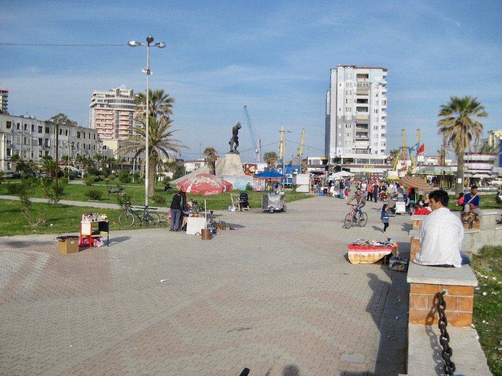 Ich schlage nun den Weg nach Durres zur Küste ein. Durres ist die zweitgrößte Stadt Albaniens und das Touristenurlaubszentrum. Ich muss über die Schnellstraße nach Durres, dass macht nicht richtig Spaß, da nur ein schmaler Randstreifen vorhanden ist und der ganze Schwerlastverkehr in Richtung Küste fährt. In Durres bekomme ich beim ersten Hotel ( Empfehlung aus dem Reiseführer ) eine Absage. Angeblich voll, sieht aber nicht so aus !. Also weiter direkt zur Strandpromenade. Hier habe ich mehr Glück. Zimmer mit direktem Meerblick. Nicht schlecht. Hier ist auch schon ganz schön was los. Überwiegend Hochhäuser, nicht wirklich schön und immer noch zwischendurch kommunistische Denkmäler !