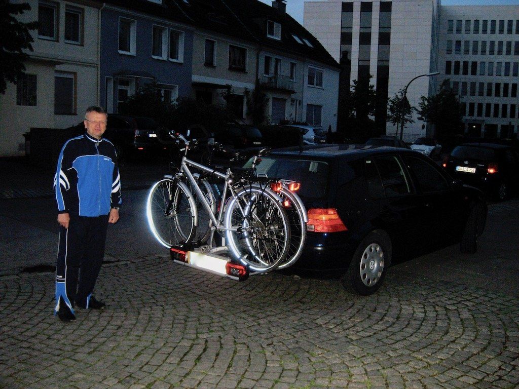 Dieter ist pünktlich um 5.30 Uhr bei mir. Das Rad auf den Heckträger, das Gepäck in den Wagen und los geht's. Unterwegs haben wir vom Wetter alles ! Nebel, Regen, Sonne !!! Während der Fahrt stellen wir fest, das wir die Warntafel für Italien nicht am Heckträger bzw. den Fahrrädern angebracht haben, wir haben sie schlichtweg zu Hause vergessen. Was soll es, wir setzten auf "Lücke". Bis kurz vor Modena sehen wir auch keine Polizei, dann überholen uns 2 Streifenwagen. Sie kümmern sich aber nicht um uns. Glück gehabt. Gegen 16.30 Uhr kommen wir in Maranello an. Es ist schwül-drückend, 28 Grad. Bei der Einfahrt fällt uns sofort das große silberne Ferrari - Pferd in einem Kreisverkehr auf. Bei einer Nachfrage bei der Polizei im Ort empfiehlt man uns das Hotel Europa. Auf Nachfrage bekommen wir ein Zimmer und können sogar das Auto während der Radreise in der Tiefgarage stehen lassen. Nach dem Duschen geht es zur Stadtbesichtigung. Maranello bietet nicht viel, der ganze Ort ist auf Ferrari ausgerichtet. Eine große Auswahl an Restaurants ist auch nicht vorhanden, einige haben auch noch zu. Was gibt es in Italien ? Na klar, Pizza, die bekommen wir in einem Schnellrestaurant. Besser als nichts. Dieter bestellt eine Ferrari - Pizza, ich eine Calzone. Trotz Schnellrestaurant sind beide lecker. Im Hotel gibt es dann noch einen Absacker, dann siegt die Bettruhe. Der Wecker für morgen ist auf 6 Uhr gestellt.