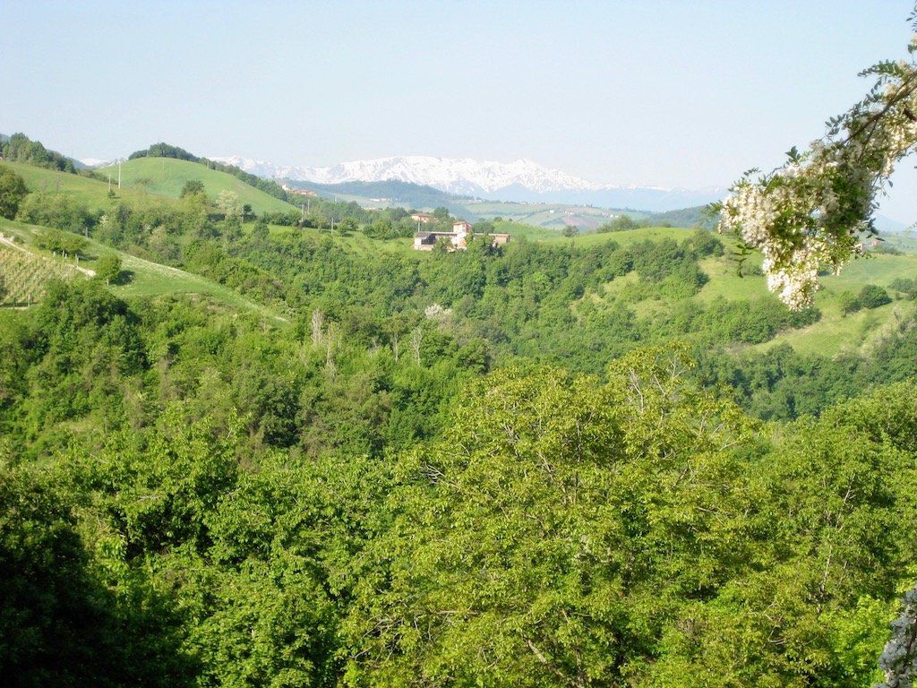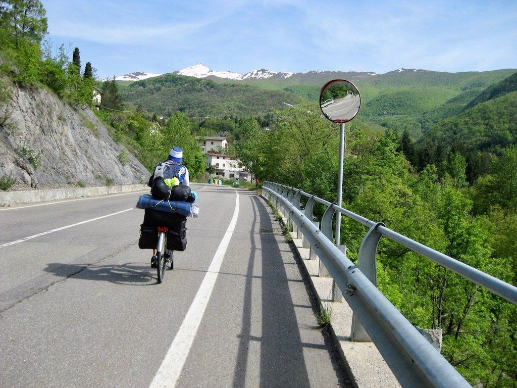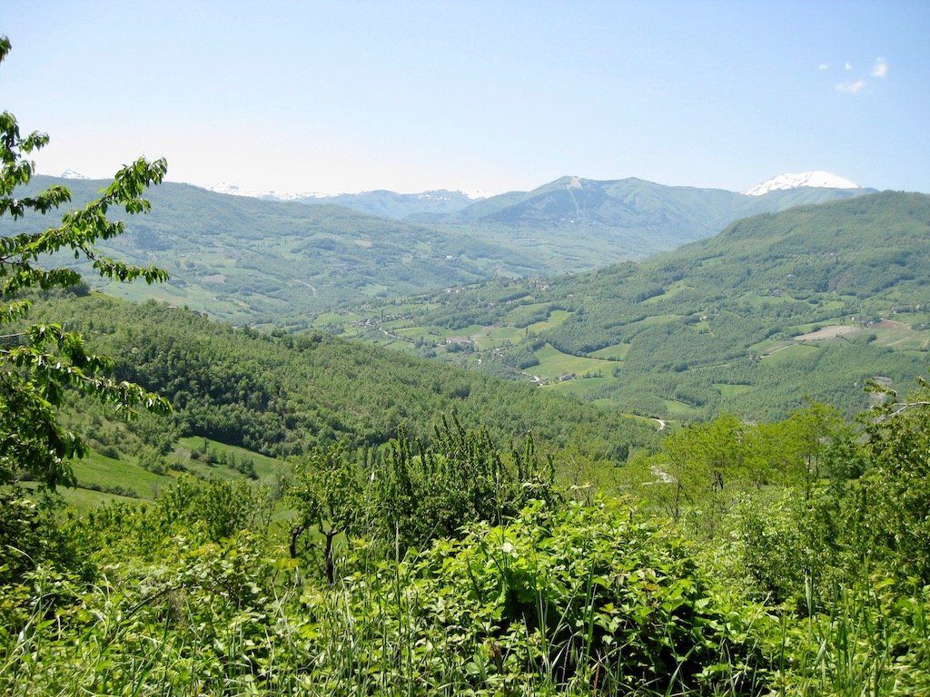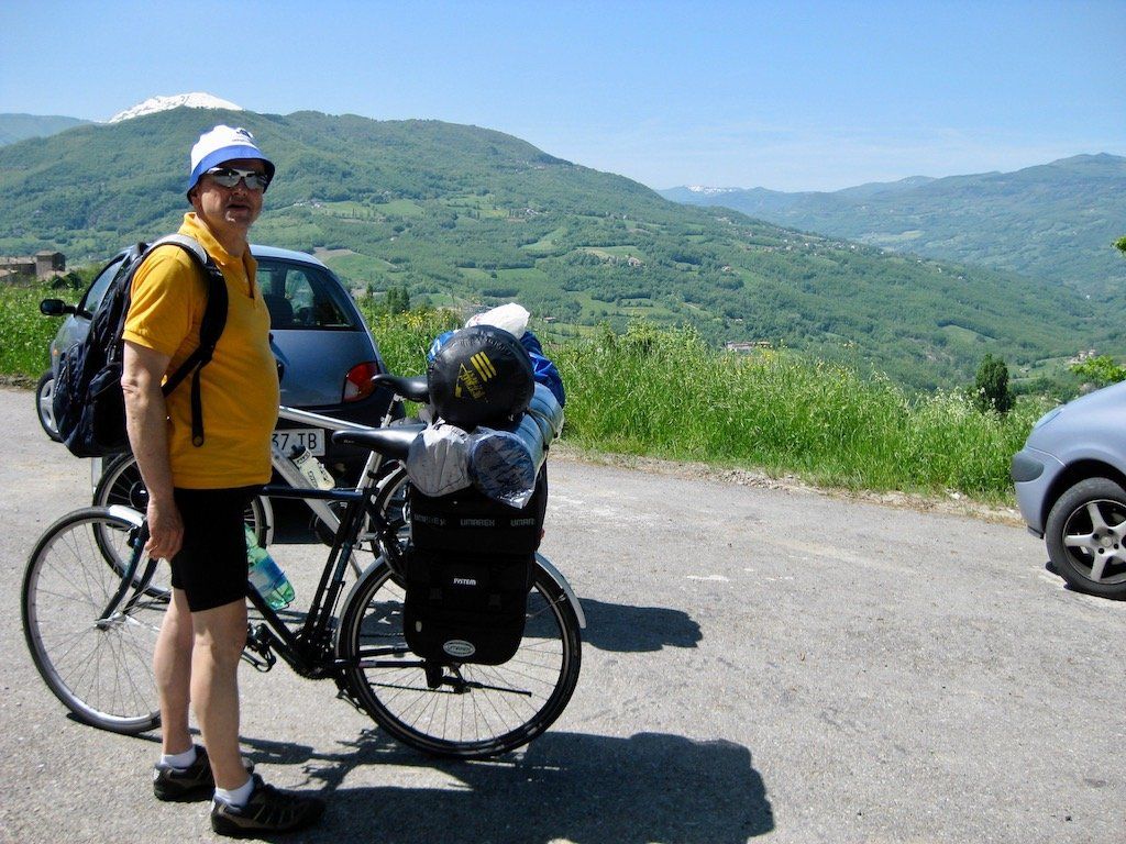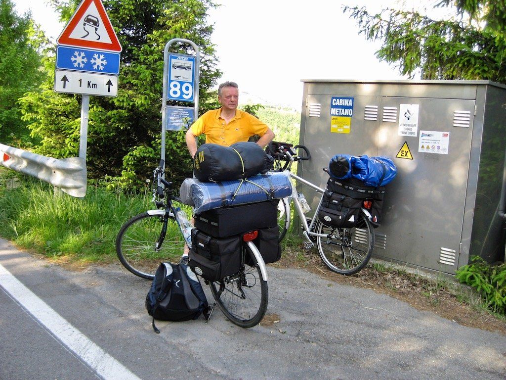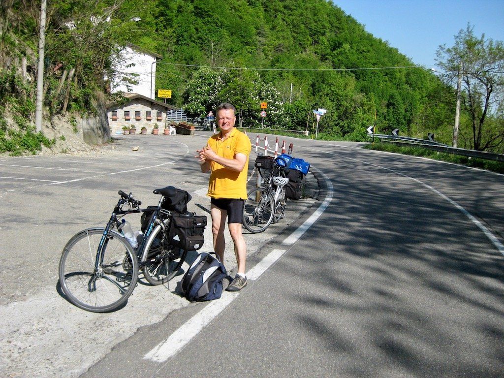 Um 5.56 Uhr werde ich wach. Es ist richtig schönes Wetter, heute könnte es heiß werden. Sachen zusammen packen und erst einmal gut Frühstücken. Beim Beladen der Räder stellen wir fest, dass wir das Gepäck gewichtsmäßig nicht richtig verteilen können. Wir haben ein Zelt sowie Isomatte und Schlafsack gegenüber den anderen Touren mit. Wir haben keine Vorderradtaschen, also muss alles hinten auf das Rad. Wir bauen ganz schön hoch. Nach anfänglichen Schwierigkeiten gewöhnen wir uns dann aber an das Fahren. Geht ja auch nicht anders. Anfängerfehler mit dem ganzen Gepäck ! Hinter Maranello geht es gleich steil in die Berge. Wir quälen uns bei blauem Himmel und 30 Grad die Berge hoch. Unterwegs bekommt Dieter erst einmal ein Hütchen und das auch noch geschenkt. Er stellt fest, das er viel zu viel eingepackt hat, jetzt ist die Erkenntnis zu spät. In Pavullo nel Frignano müssen wir zum ersten Mal die Wasservorräte auffüllen. Danach geht es die Serpentinen runter. Was für eine Abfahrt, aber wir Wissen, auf der anderen Seite geht es wieder hoch. Es geht Richtung Vesale, es folgen lange und steile Anstiege. Unterwegs werden wir aber immer wieder mit traumhaften Aussichten entschädigt.