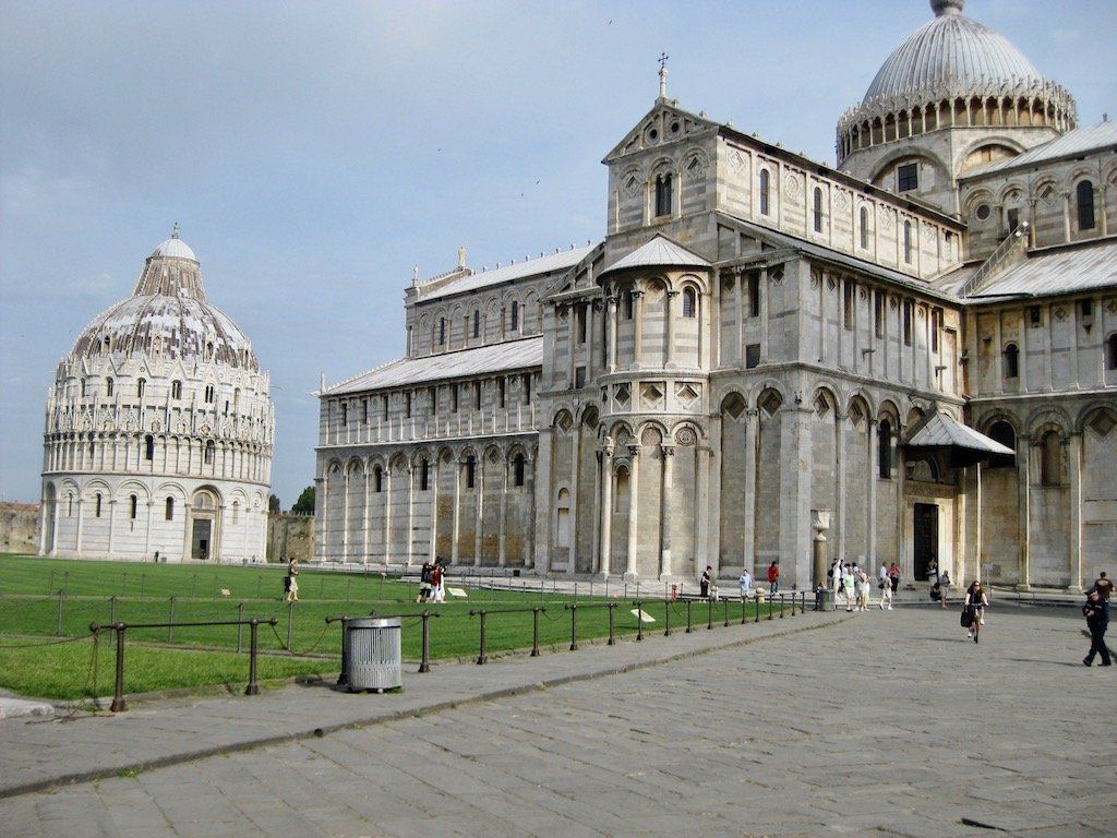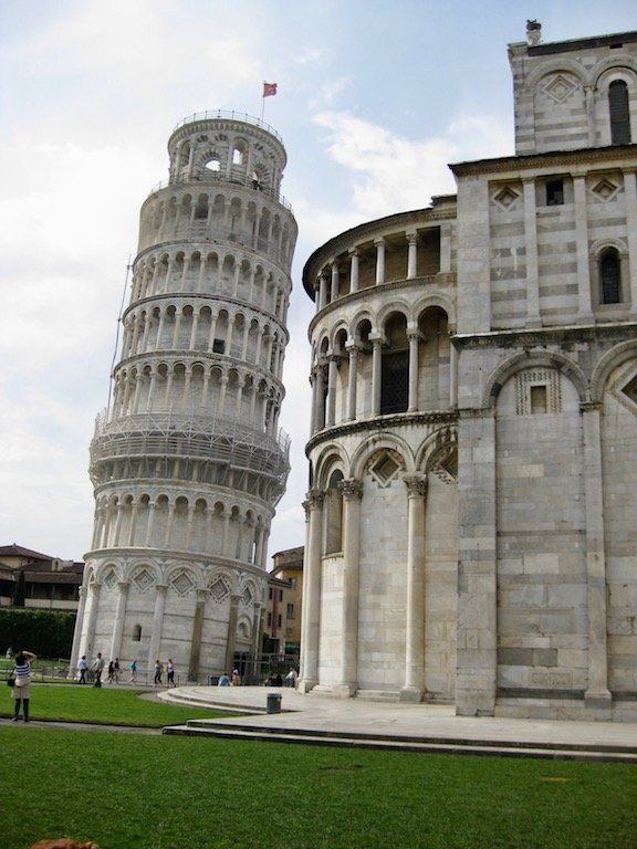 Der Wecker schellt wieder um 6 Uhr. Nach dem Zusammenpacken teilt uns die Vermieterin mit, dass es Frühstück nebenan im Coffeeshop gibt, der öffnet aber erst ab 7.30 Uhr ! Vielleicht !!! Auf Nachfrage bekommen wir bei ihr aber dann doch einen Kaffee, auf das in Italien üppige Frühstück nebenan verzichten wir. Wir radeln dann ohne Frühstück los. Bis nach Pisa ist es ja nicht weit. Direkt hinter der alten Stadtmauer sehen wir auch schon die Kirche und den schiefen Turm. Eine Besichtigung kann leider nicht stattfinden, da alles erst um 10 Uhr öffnet, so lange wollen wir nicht warten, also alles nur von außen anschauen.