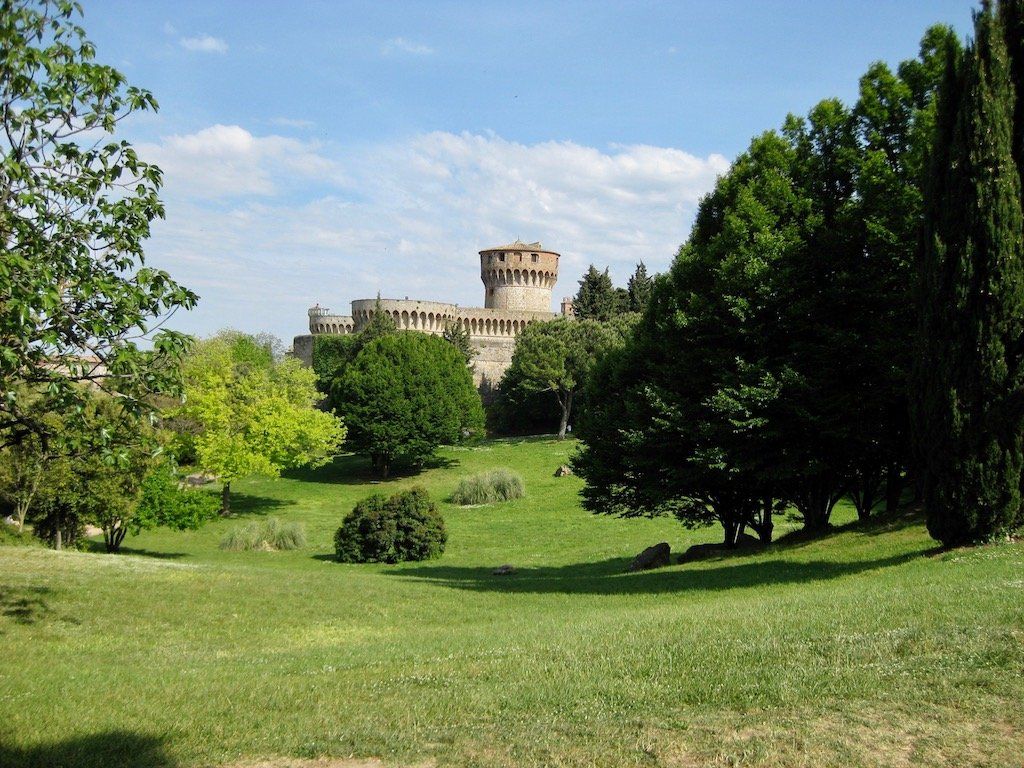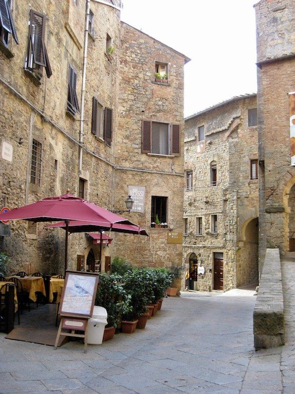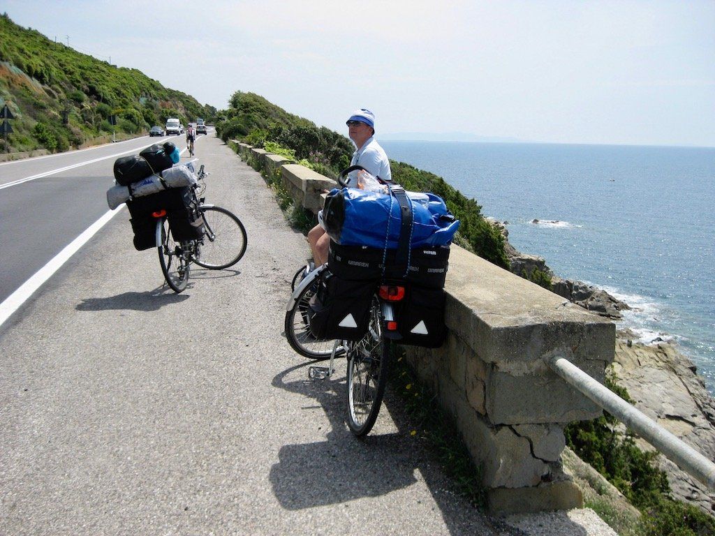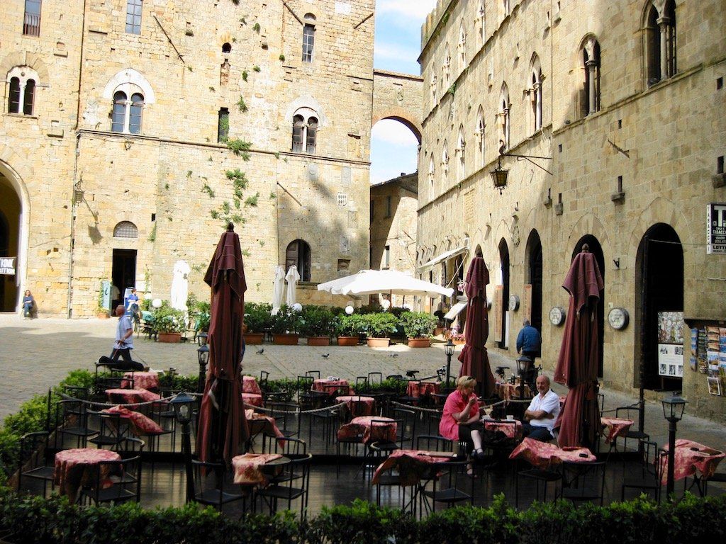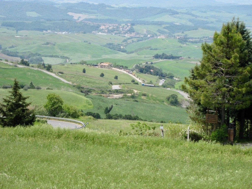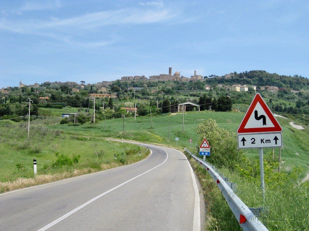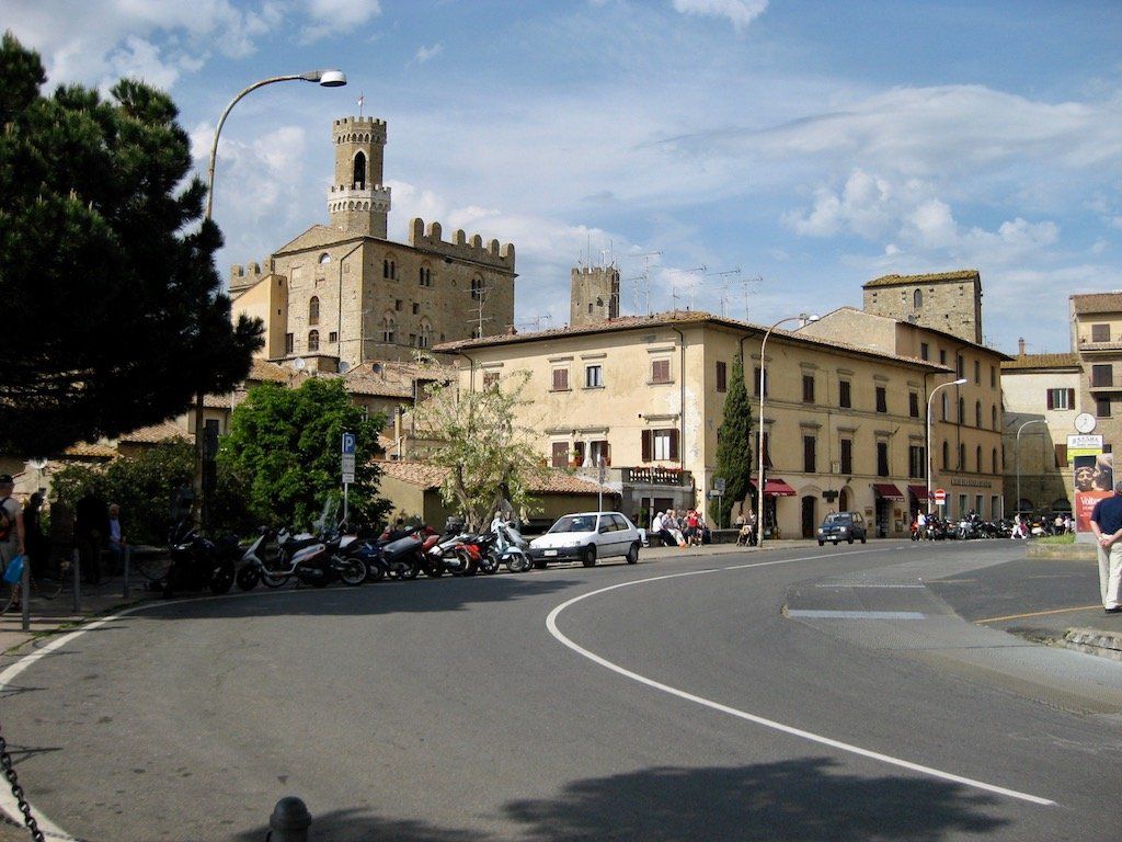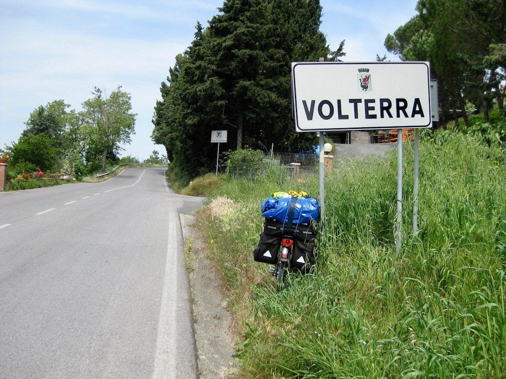 Wir werden um 6.30 Uhr wach. Das Zelt ist nass und muss erst mal getrocknet und die Sachen müssen wieder verpackt werden. Um 8.15 Uhr brechen wir dann auf. Nach 4 Kilometern gibt es erst einmal Frühstück. Wir haben Salami und Brot gekauft, Cappuccino machen wir selber. Die Fahrt verläuft dann über ruhige Straßen und durch schöne Landschaft. Wir biegen dann vom Meer ab in Richtung Volterra. Es ist in der Zwischenzeit wieder richtig warm geworden. Dann geht es an den Aufstieg nach Volterra. Hier müssen wir auf den nächsten 10 Kilometern 500 Meter hoch. Unterwegs gibt es immer wieder Trinkpausen. Da der Wetterbericht für die Nacht Regen angekündigt hat, nehmen wir ein Zimmer und brechen dann zur Stadtbesichtigung auf. Schon eine tolle kleine Stadt. Wir sind hier auf 500 Meter Meereshöhe und man hat eine tolle Fernsicht. Wir können auch noch einen alten Palazzi besichtigen und bekommen noch eine kostenlose Weinverkostung. Abendessen gibt es dann in einem tollen Restaurant. Auf dem Rückweg zum Zimmer fängt es dann leicht an zu Regnen, die Entscheidung ein Zimmer zu nehmen war also richtig, zumal das Zelt, wie wir gesehen haben, doch wohl nicht so ganz dicht ist. Also nur bei schönem Wetter zelten.