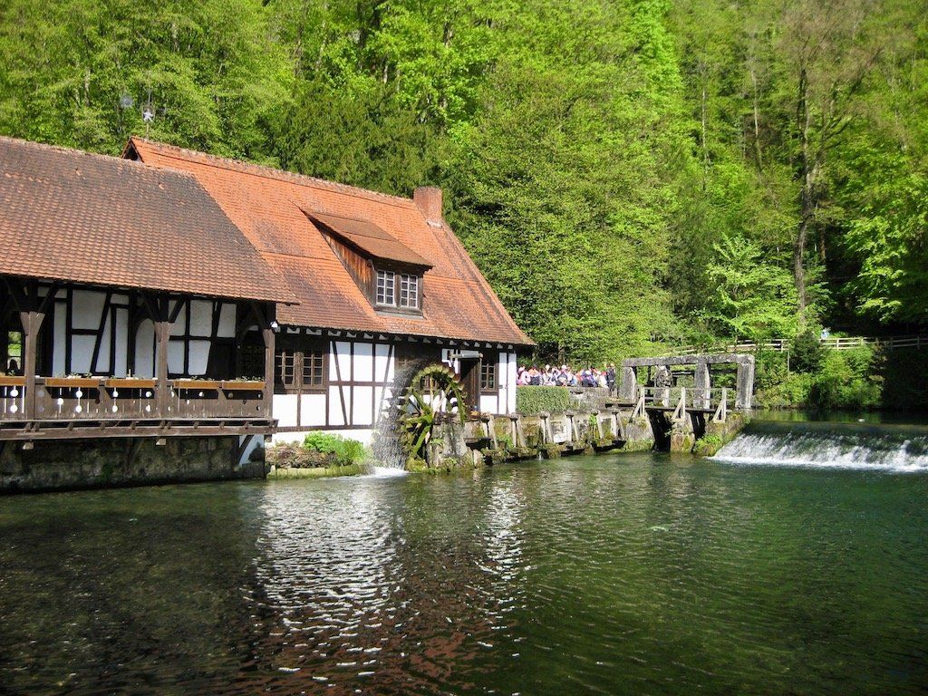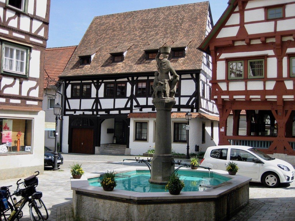 Gut eine Stunde nach dem Frühstück sind wir am " Blautopf " angekommen. Drum herum stehen schöne alte Fachwerkhäuser.