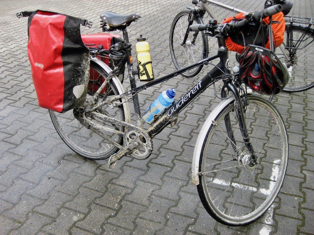 Hinter Ingolstadt geht es dann auf den unbefestigten Radweg. Das Fahren fällt schwer, die Reifen drücken sich in den durchweichten Untergrund. Wir sehen auf Grund des Wetters und des Untergrundes aus wie die Schweinchen. Hinter Vohburg nehmen wir dann die Landstraße , hier kann man bei dem Wetter besser fahren. In Neustadt a.d.Donau haben wir dann im Gasthof Gigl ein Zimmer. Die Räder können wir im Hof erst einmal abspritzen. Nach einer ausgiebigen Dusche geht es zum Italiener. Nach einem leckeren Essen, Nudeln mit Putenbruststreifen gibt es sogar noch einen Grappa auf Kosten des Hauses.