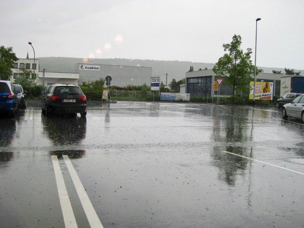Der Himmel hinter uns ist schwarz. Wir fahren los, kommen aber nur bis zum Ortsrand von Kehlheim. Hier fängt es an zu regnen. Ich entdeckte eine Netto-Markt mit Bäckerei. Nichts wie hinein. Als wir die Räder unter das Vordach schieben, öffnet der Himmel alle Schleusen, es schüttet. Glück gehabt.