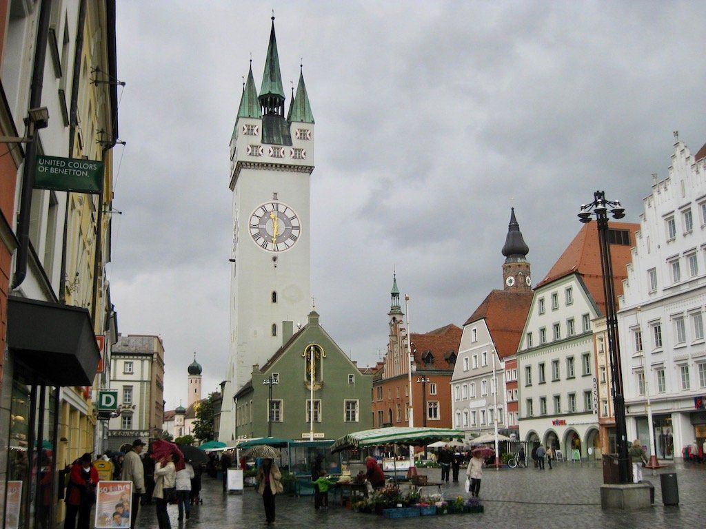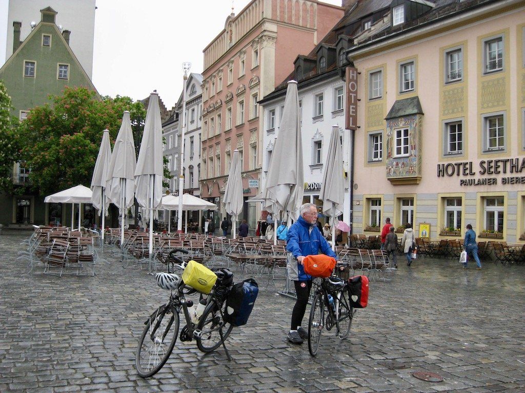 Gegen 10.45 Uhr sind wir in Straubing. Unterwegs hat es mal mehr, mal weniger geregnet. Wir fahren zum Bahnhof. Rückfahrttickets gibt es von Landshut über München nach Dortmund. Nix mit Sparpreis, nur ein kleiner Preisnachlass. Nach Passau wollen wir jetzt bei dem Wetter nicht mehr. Wir schieben dann die Räder durch die Fußgängerzone, da wir beschlossen haben, heute noch den Zug nach Plattling zu nehmen.