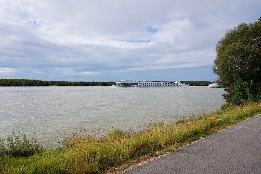 Nach der Besichtigung der Basilika queren wir wieder die Donau, da wir unsere Fahrt auf der slowakischen Seite fortsetzen. Mittagspause machen wir im slowakischen Örtchen Moca an der Donau. Gut das wir einige Sachen für die Mittagsrast dabei hatten, diese verzehren wir auf einer Bank mit Blick auf die Donau. Das Örtchen Moca war wie ausgestorben, kein Café, kein Restaurant, das Schiffsrestaurant stand zum Verkauf und war ebenfalls geschlossen. Wir setzten dann unsere Fahrt bei extremen Gegenwind fort, kommen nur langsam voran, da wir auf dem Damm fahren und uns der Wind voll erwischt. Gegen 15 Uhr erreichen wir unseren slowakischen Übernachtungsort Komarno, " A7 Apartments ". Komarno ist ein netter kleiner Ort mit einem futuristischen kleinen Zentrum, dem Europlatz. Wir können auch hier viel Leerstand feststellen, die Slowakei ist eines der ärmeren Länder in der EU.