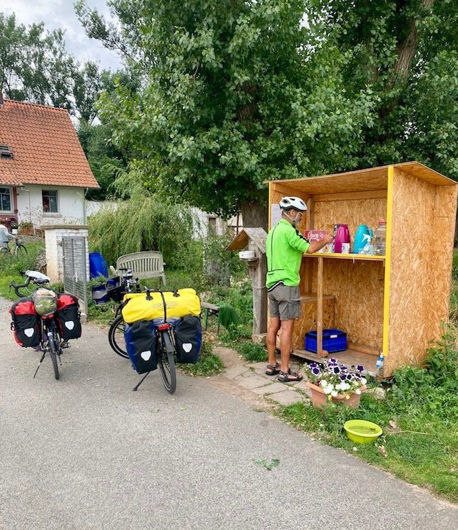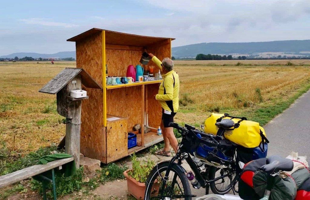 Ein paar Kilometer weiter am Wegesrand eine nette kleine Pausenüberraschung. An einem Bauernhof ist ein Getränkestand aufgebaut. Es gibt frischen Kaffee, warmes Wasser für Tee ist auch vorhanden. Im Kühlschrank befinden sich die kalten Getränke, sogar Bier. Wir gönnen uns nur einen Kaffee. Der Stand wird gut angenommen, es halten noch mehrere Radler. Mal eine tolle Idee für uns Radler.