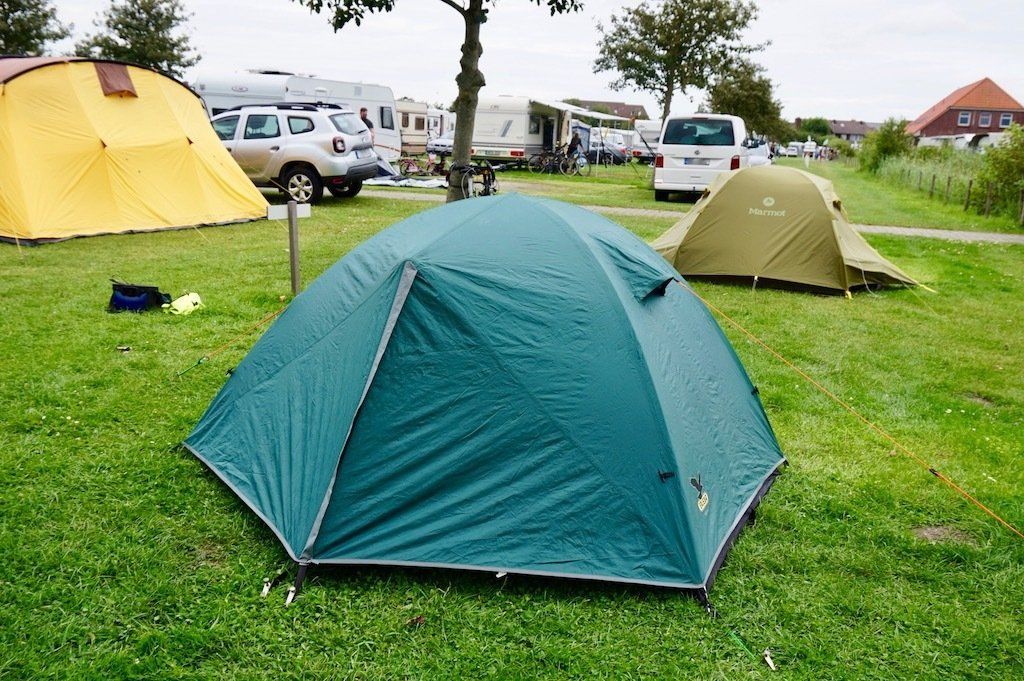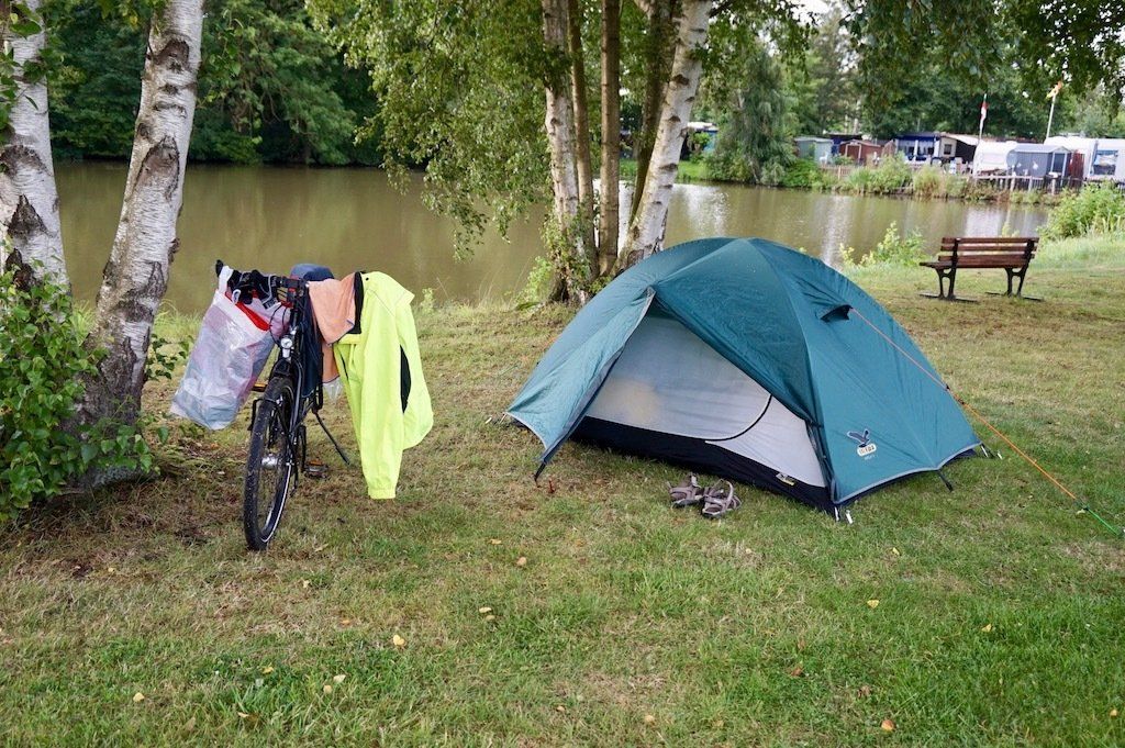 Nach noch 2 weiteren kleinen Regenpausen treffen wir gegen 16 Uhr auf dem Campingplatz an der Jade ein. Kurz einchecken und wir können unsere Zelte direkt am kleinen See aufbauen. Einen Tisch mit Bank gibt es hier auch. Da ein leichter Wind geht, sind unsere heute Morgen feucht eingepackten Zelte schnell trocken. Zum Abendessen geht es dann in das zum Campingplatz gehörende Restaurant. Sehr lecker und günstig. Das Wetter hat sich in der Zwischenzeit auch gebessert. Mit Einbruch der Dunkelheit geht es wie immer ins Zelt und auf die Matratze.