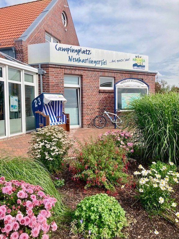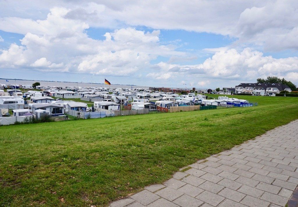 Nach 20 Minuten geht's weiter. Neuharlingersiel und den Campingplatz erreiche ich dann um 15.45 Uhr. Kurz Jochen informiert das ich an der Pforte warte. Jochen hatte mir schon einen Stellplatz reserviert, der Campingplatz ist so gut wie ausgebucht. Eine herzliche Begrüßung, dann kurz einchecken. Ziemlich abseits der Waschhäuser liegt die Wiese für unsere Zelte. Nachdem ich mein Zelt neben dem von Jochen aufgebaut habe, geht es auf dem Deich in den Ort.