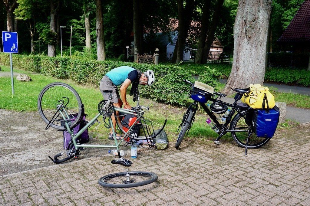 Keine 20 Minuten später ist Jochen dann auch wieder da und wir besorgen uns erst einmal einen Döner, der dann am Kai verspeist wird. Wir machen uns dann zusammen noch zu einem weiteren Termin von Jochen auf. Dieser liegt etwas abseits der Weser am Rande eines Ausflugsgebietes. Jochen bleibt plötzlich stehen. Sein Hinterrad ist platt. Das ganze Gepäck runter, jetzt geht´s ans flicken.