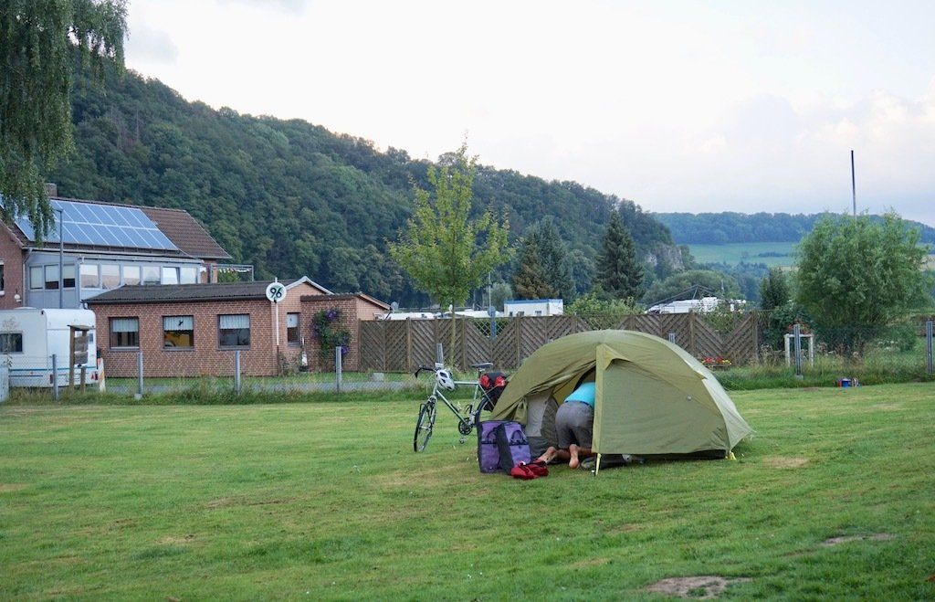 Wir kürzen nun unseren Weg ein wenig ab und verlassen die Weser in Richtung Rinteln. Dafür machen wir jetzt einige Höhenmeter. Gegen 16 Uhr erreichen wir unseren Campingplatz Helenensee in der Nähe von Rinteln. Wir können direkt am See zelten, dafür gibt es auch hier für die armen Radtouristen mal wieder keinen Tisch oder eine Bank.
